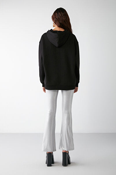 Alena Women's Basic Kangaroo Pocket Oversize Organic Cotton Zipper Hooded Black Sweatshirt