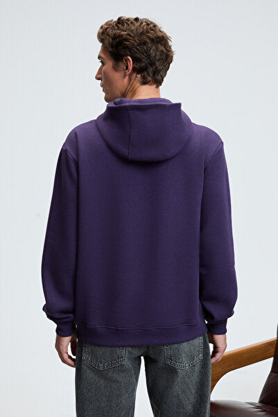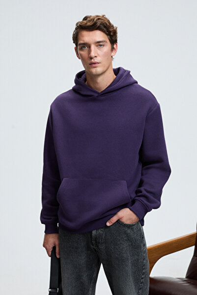 AMOS Men's Soft Fabric 3 Thread Oversize Hooded Purple Sweatshirt with Kangaroo Pocket