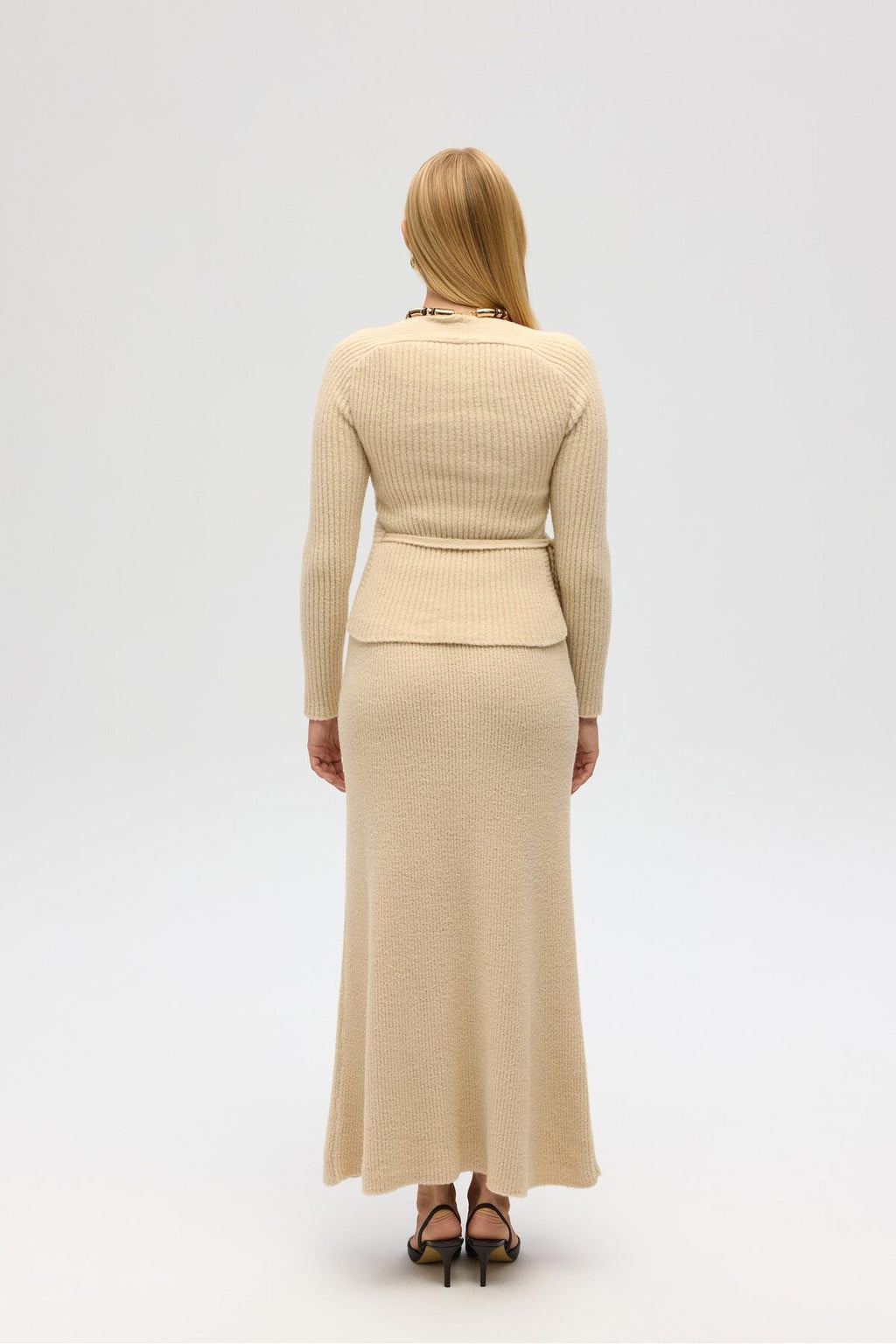 Beige Top-Skirt Set with Fluff Tie