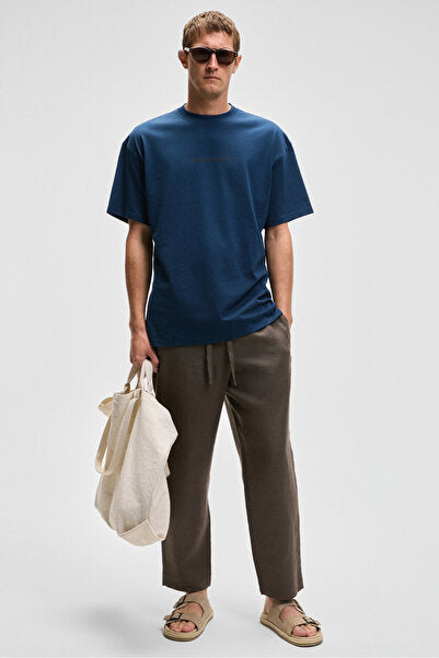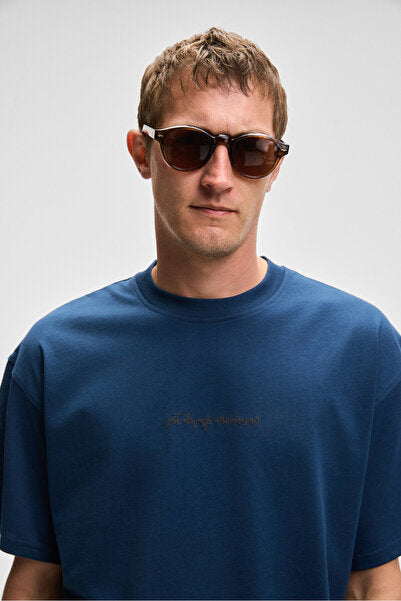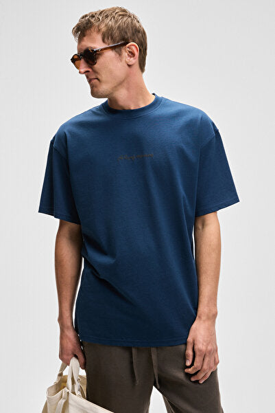 BENFICA Men's 100% Organic Cotton Print Detailed Oversize Short Sleeve Crew Neck Navy Blue T-Shirt