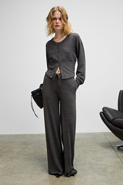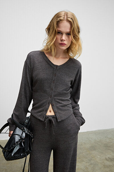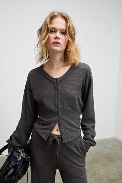 CLARITA Women's Soft and Flexible Fabric Buttoned Crop Dark Gray Cardigan