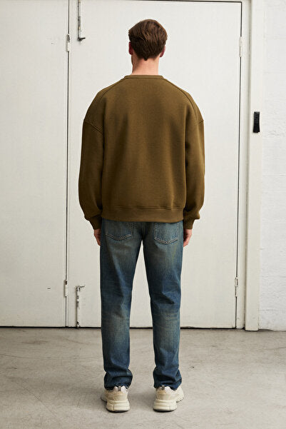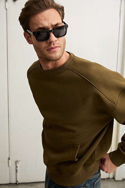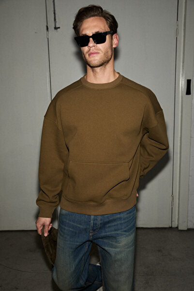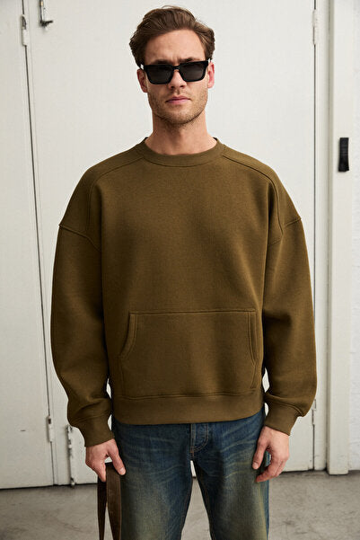 COYOTES Men's Crew Neck Kangaroo Pocket Organic Cotton Regular Fit Dark Khaki Sweatshirt