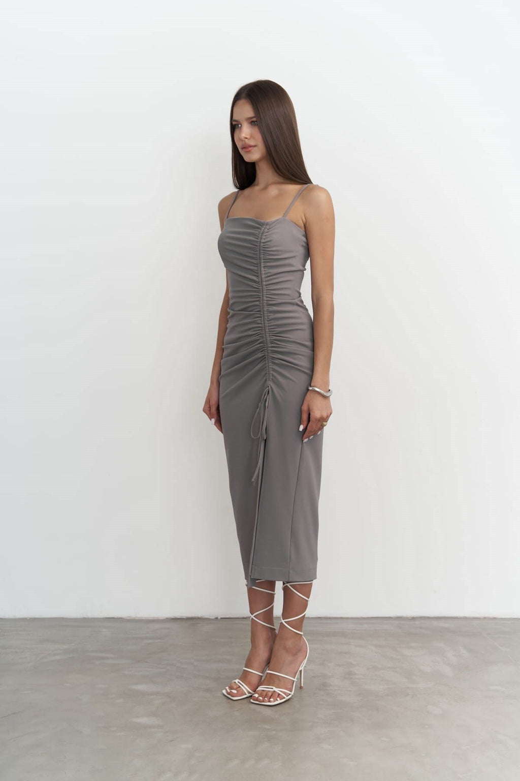 Custom front shirred gray midi size dress