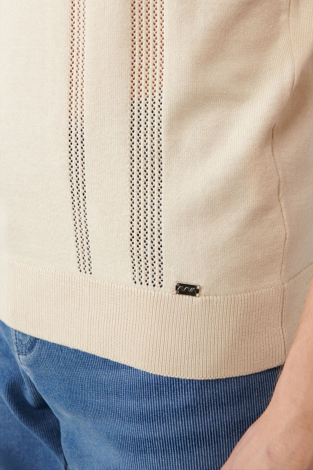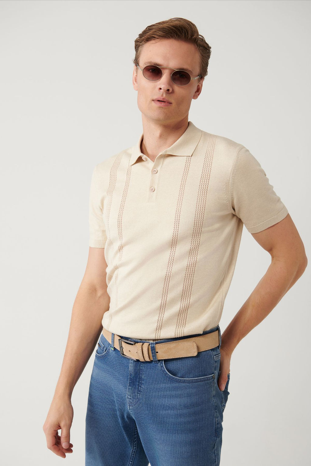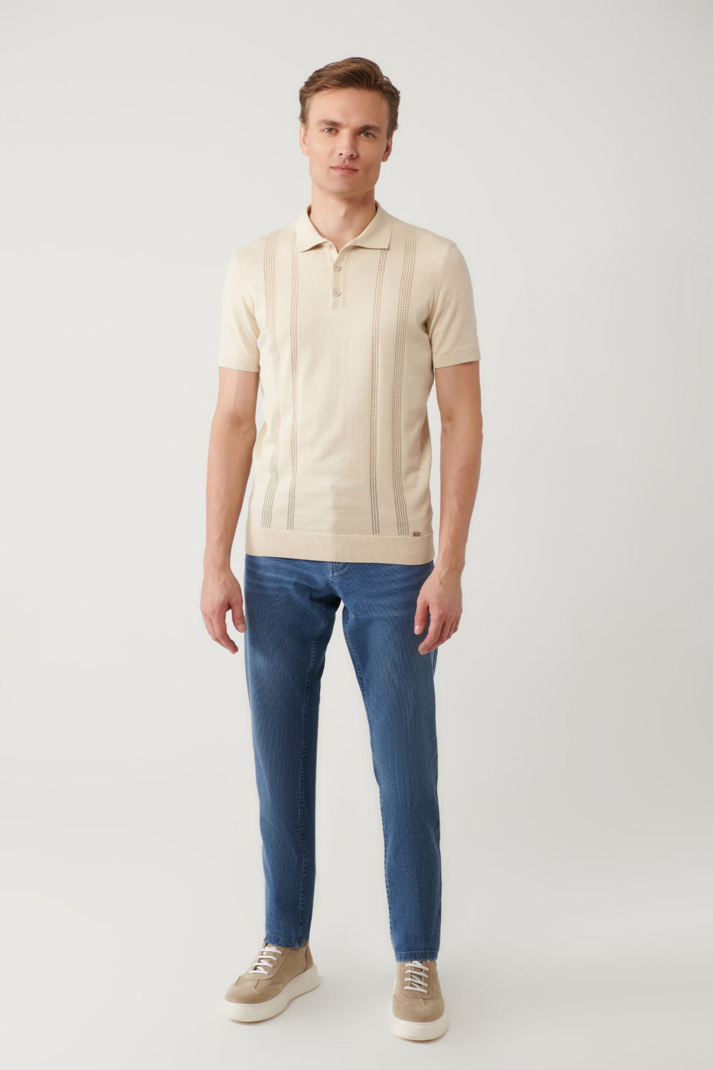 Erkek bej 3 düğmeli ajurlu polo yaka triko t-shirt a41y5096
