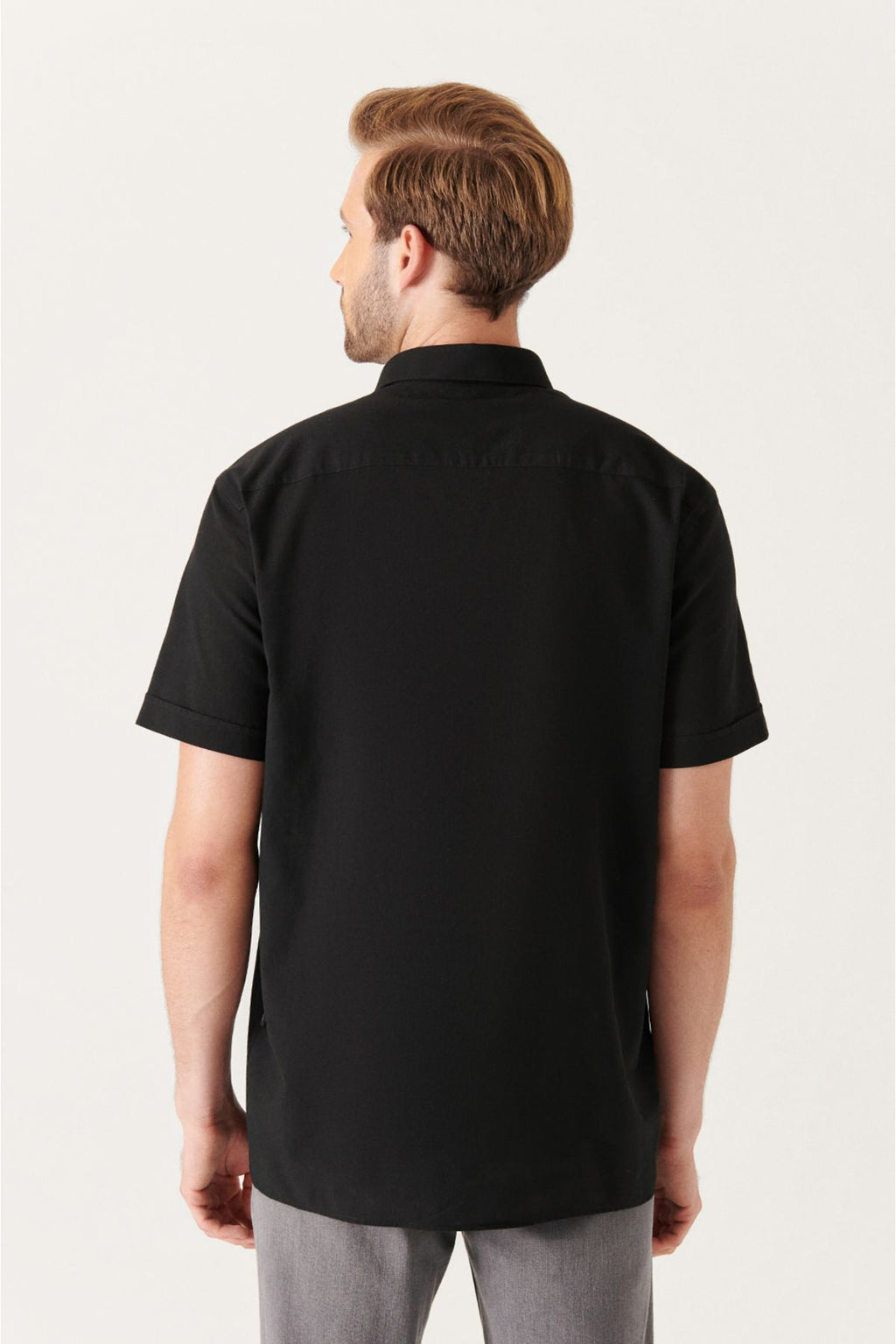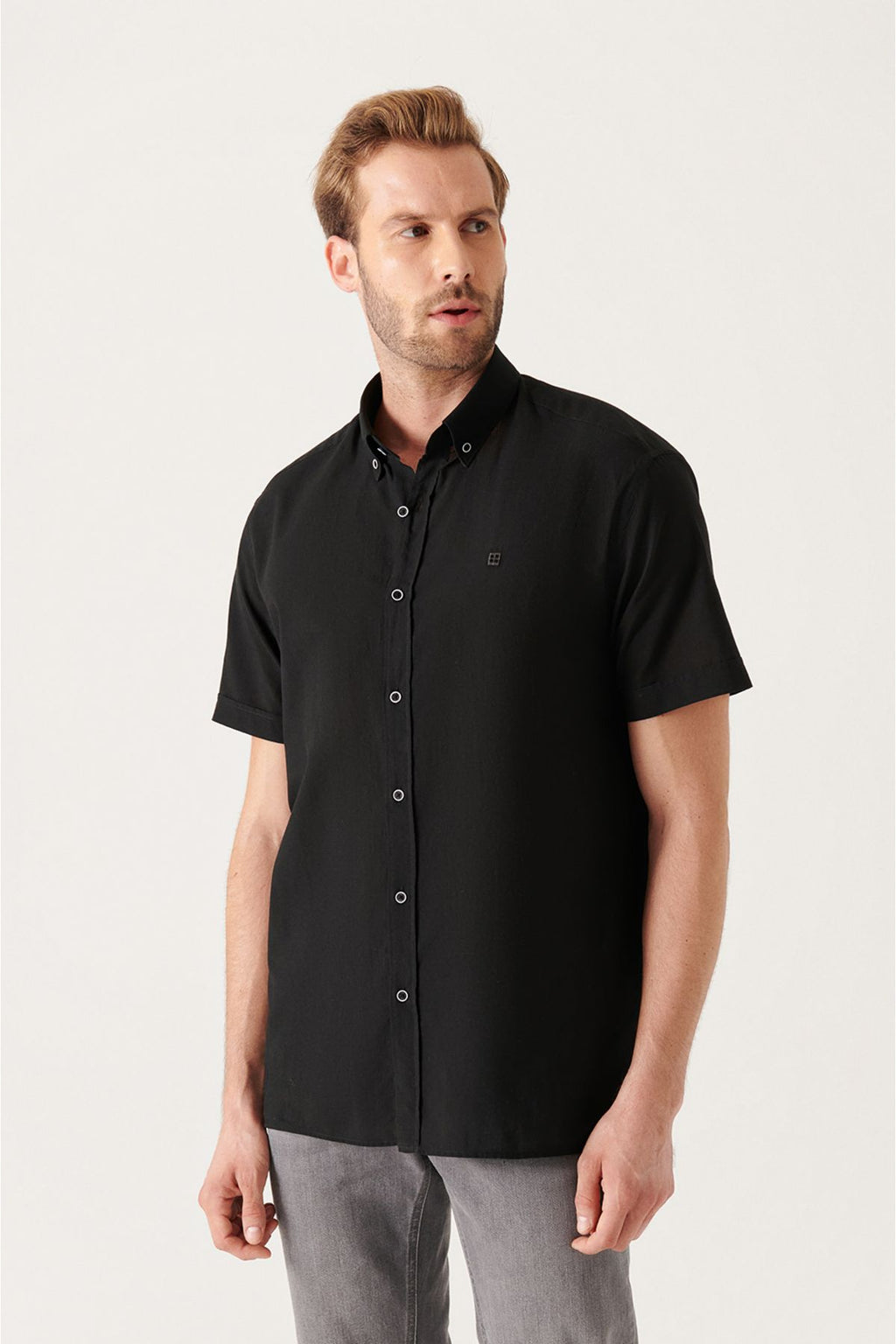 Erkek Siyah Düğmeli Yaka %100 Pamuk Ince Kısa Kollu Gömlek E002210