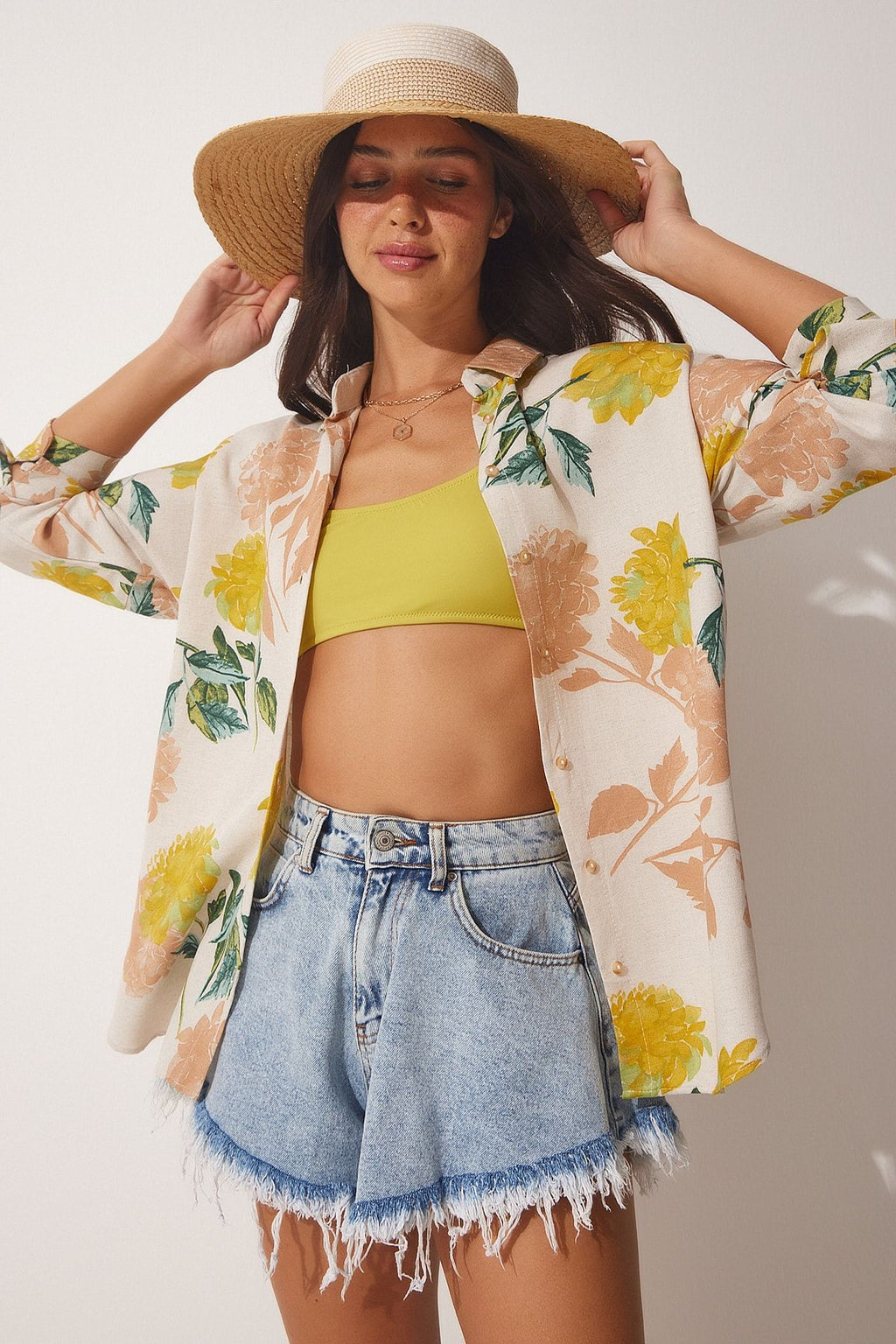 Female Beige Biscuit Patterned Oversize Oversizle Fin Viscose Shirt BH00418