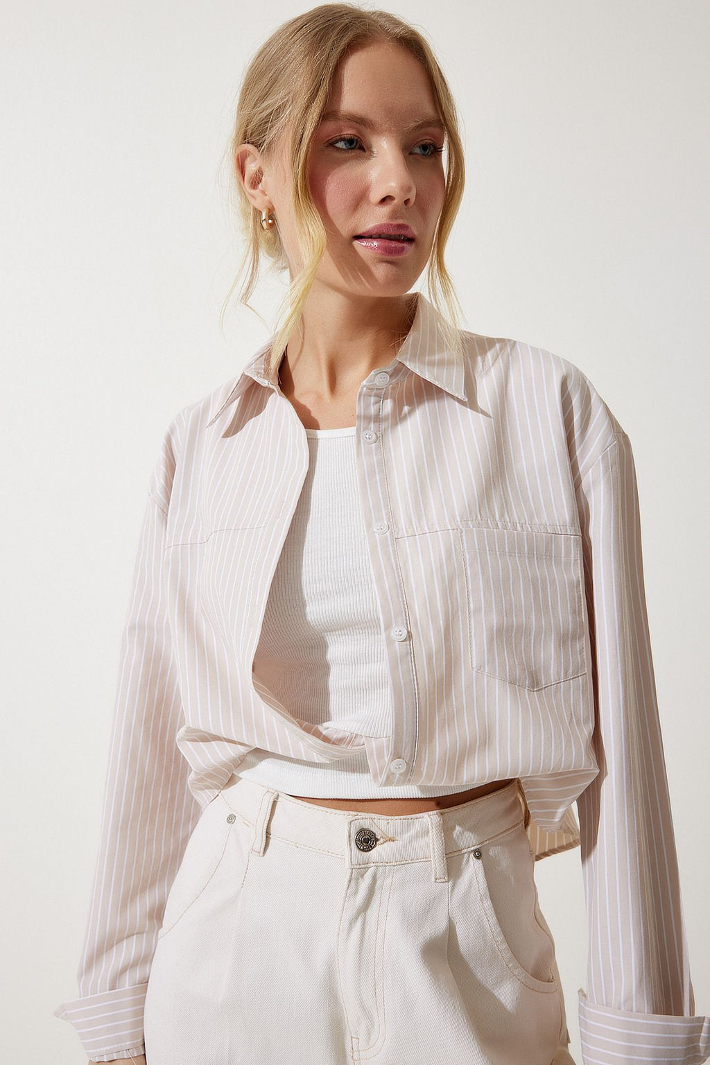 Female Beige Blouse Detail Crop Shirt RG00022