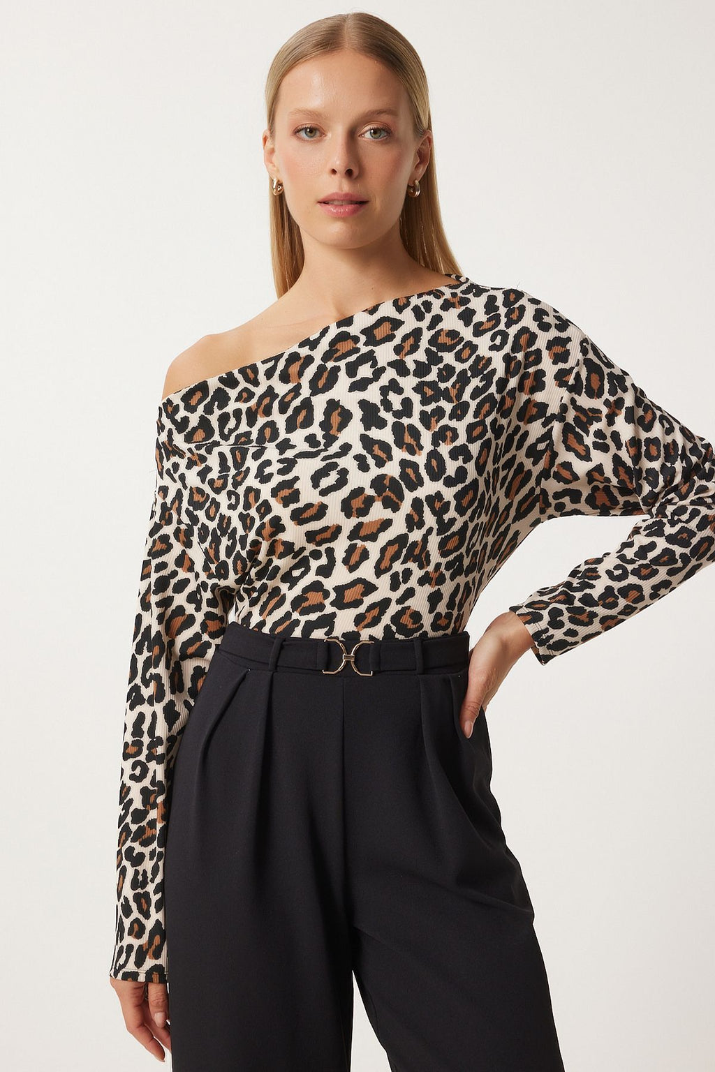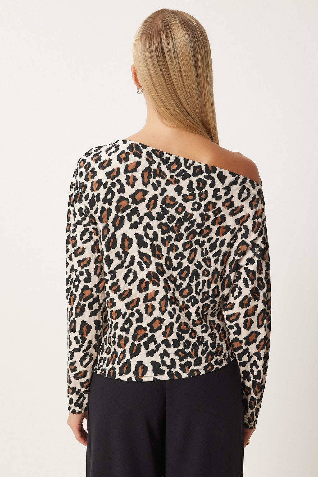 Female Beige Brown Leopard Patterned One Shoulder Wick Knitting Blouse FF00166