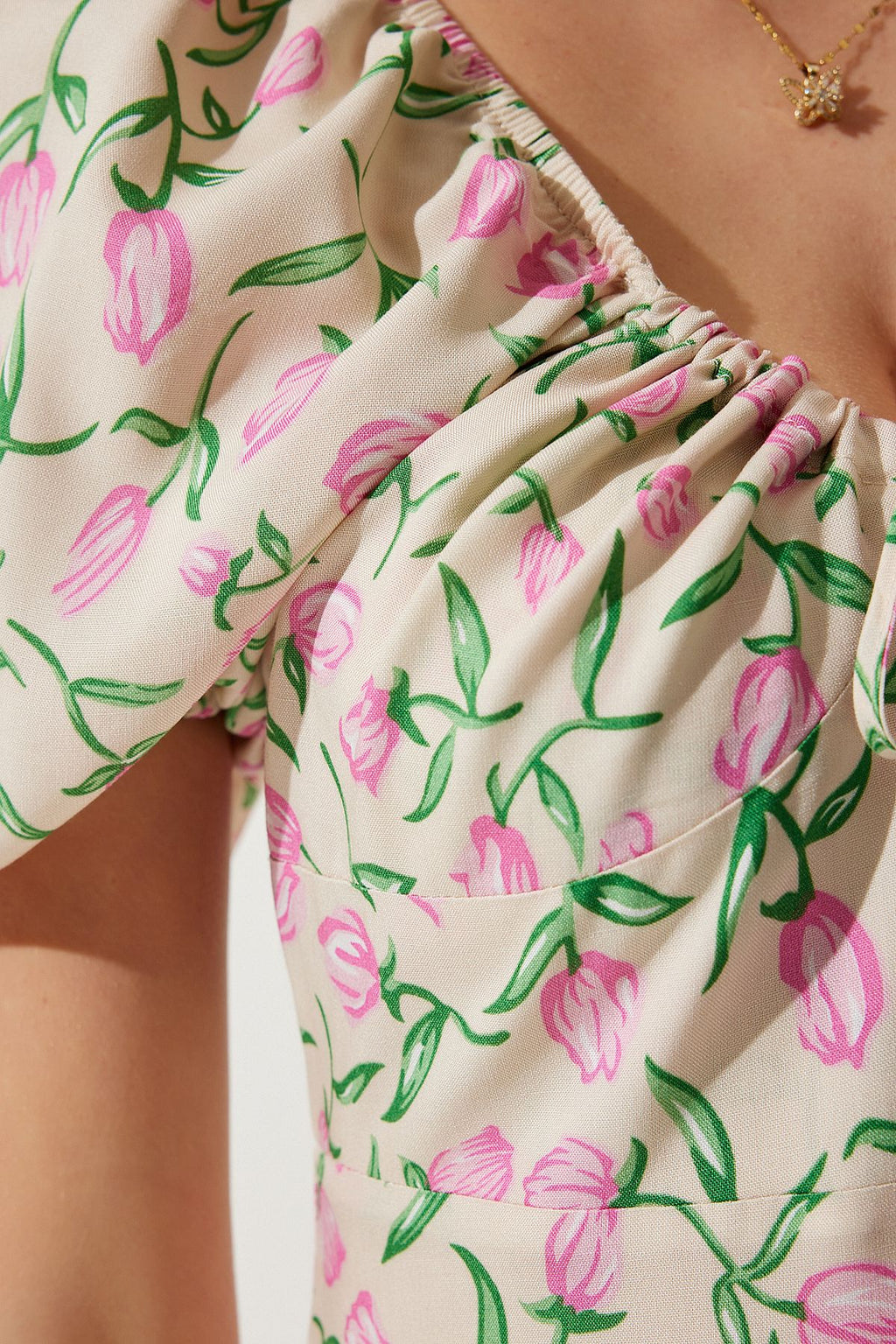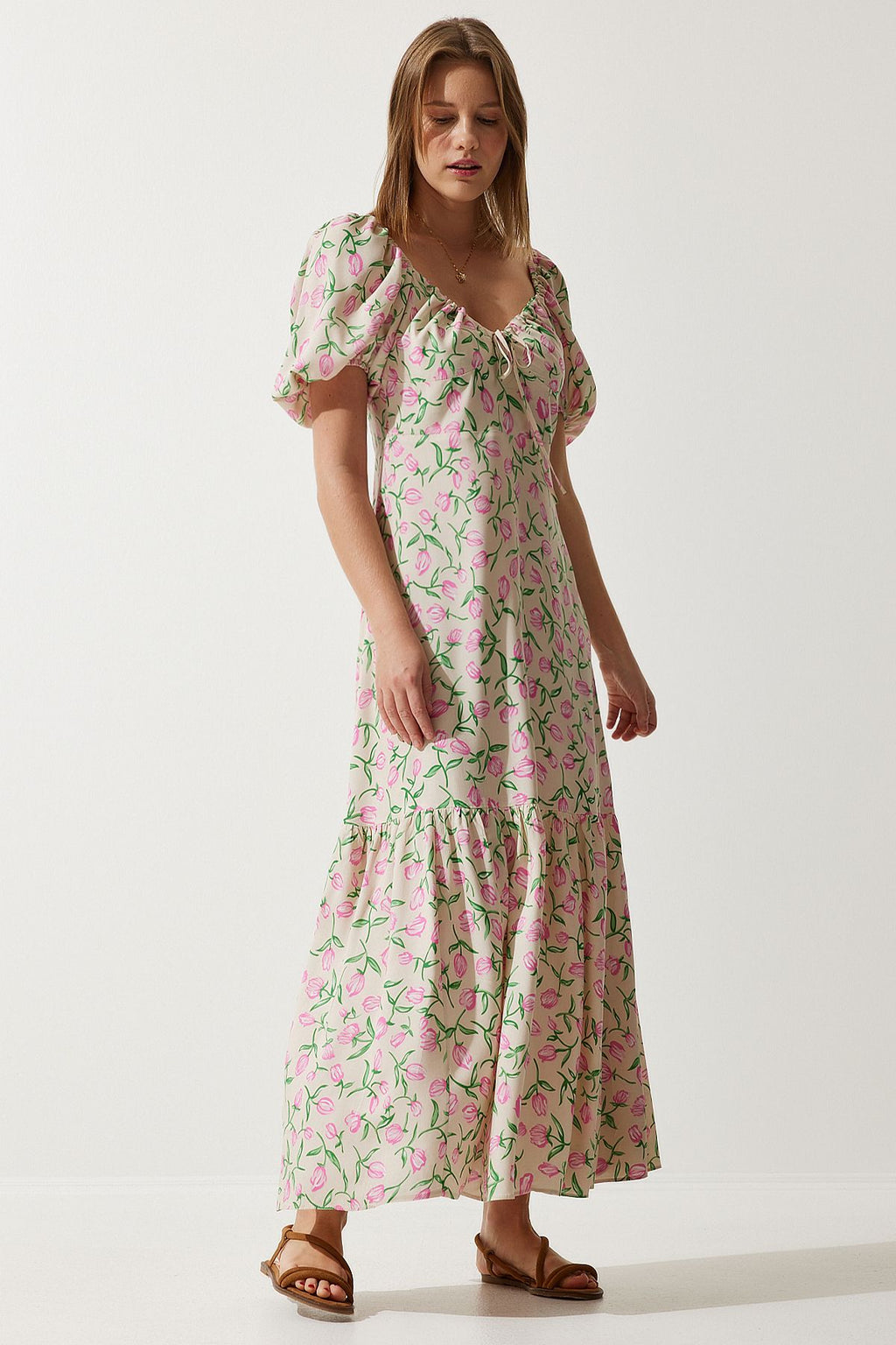 Female Beige Pink Patterned Balloon Sleeve Summer Viscose Dress FN03177