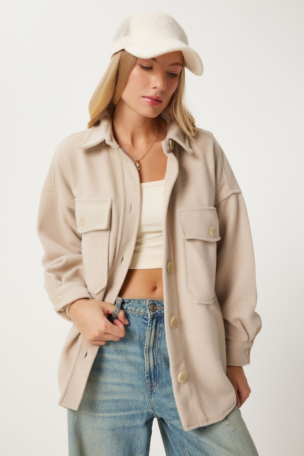 Female beige pocket stamp shirt jacket nv00071