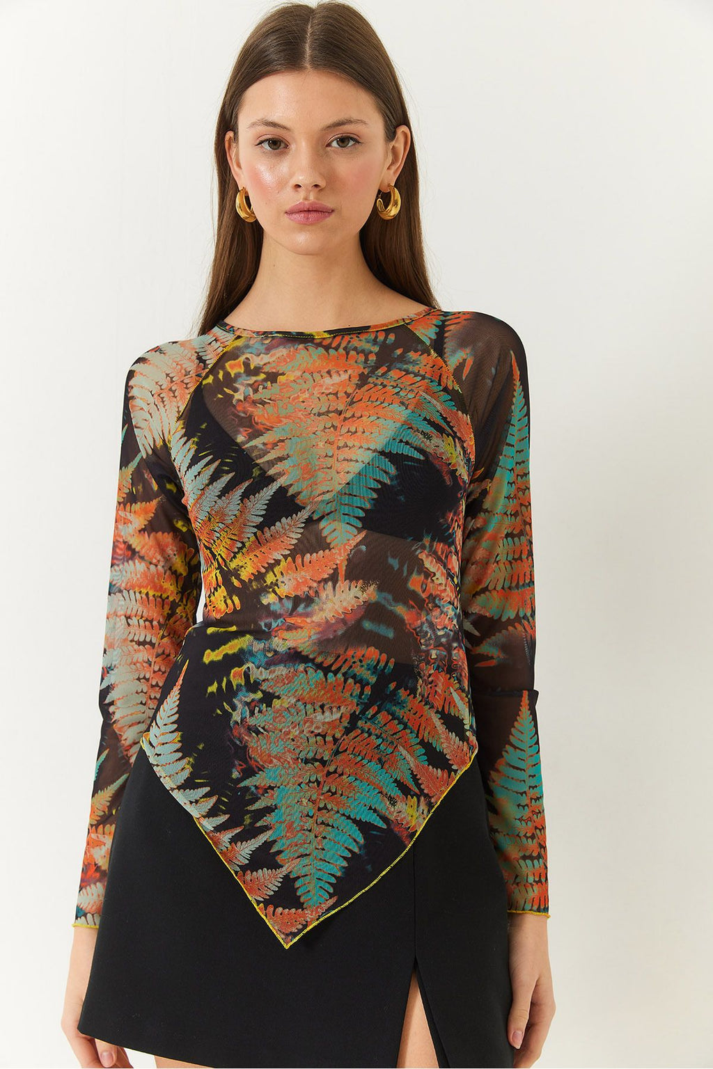 Female Bicycle Collar Digital Printed Asymmetric Cutting Tulle Blouse 60261368