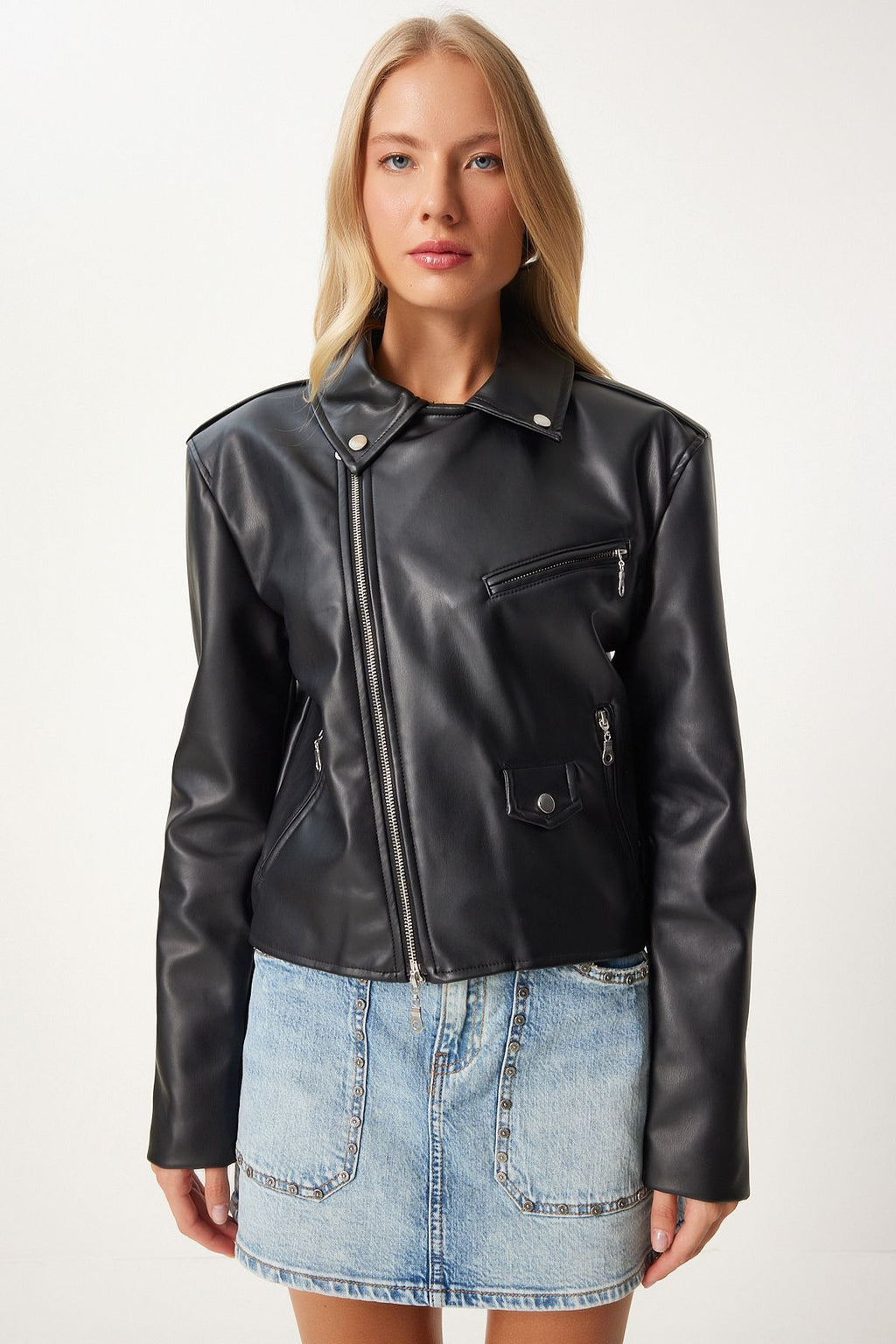 Female Black Artificial Leather Crop Biker Jacket FN03305