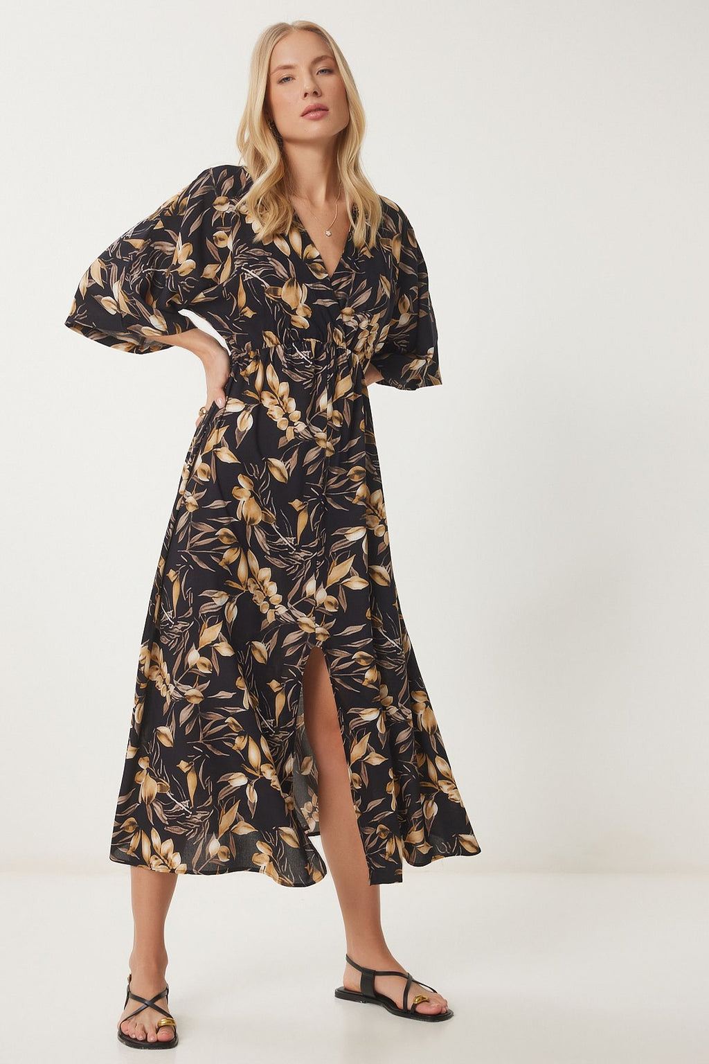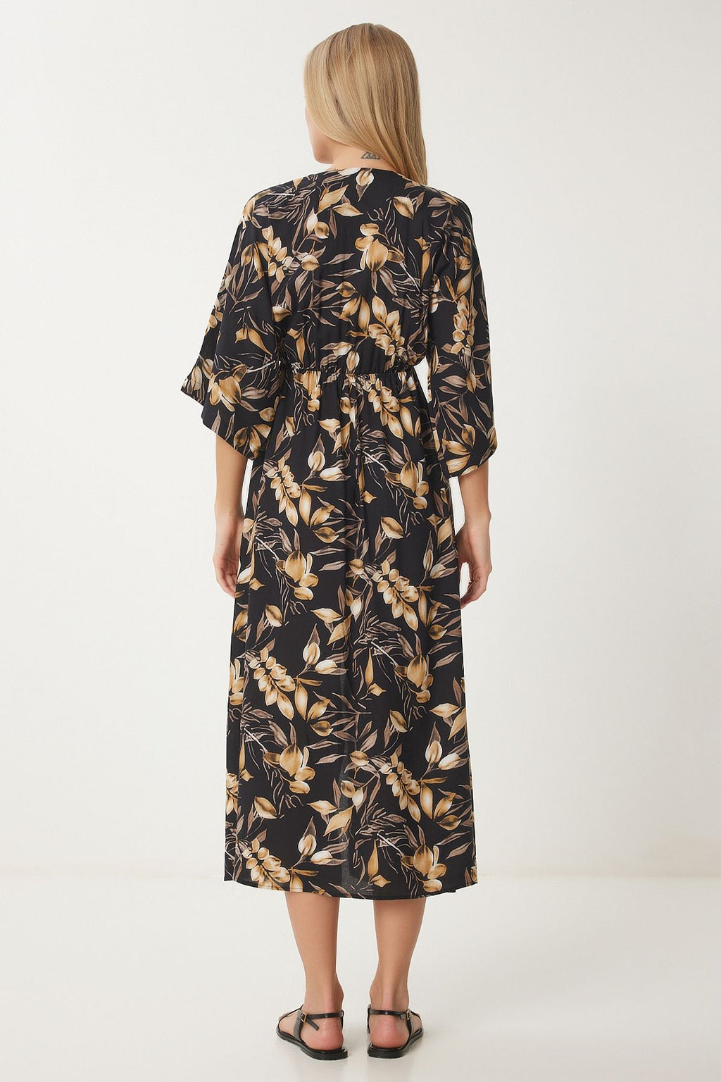 Female Black Beige Anvelop Yaka Patterned Summer Viscose Dress DK00166