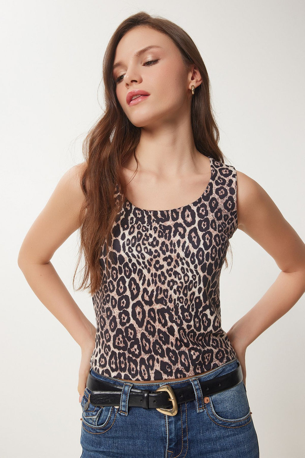 Female Black Beige Leopard Patterned Sleeveless Sandy Blouse AN00225