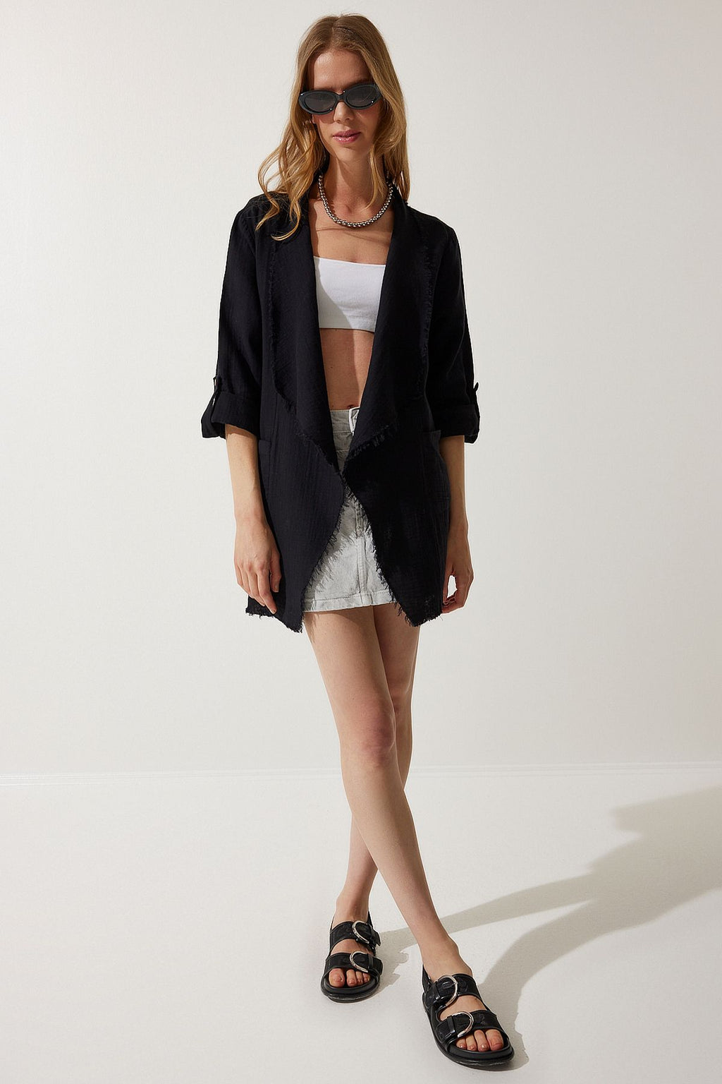 Female black fringer detailed asymmetric muslin jacket sa00020