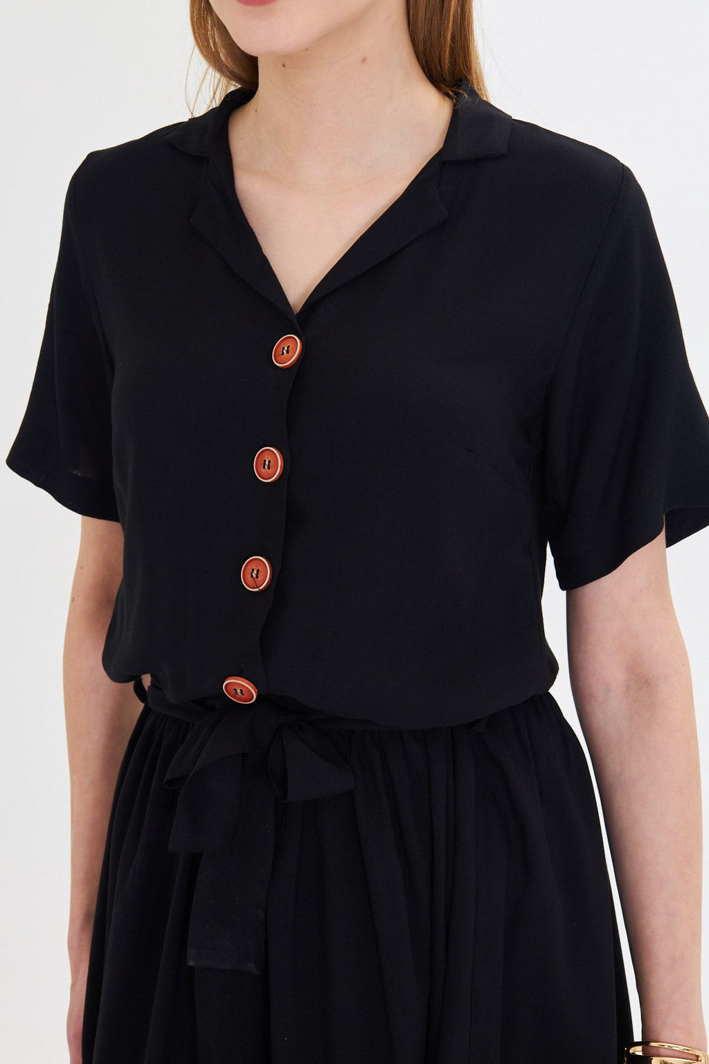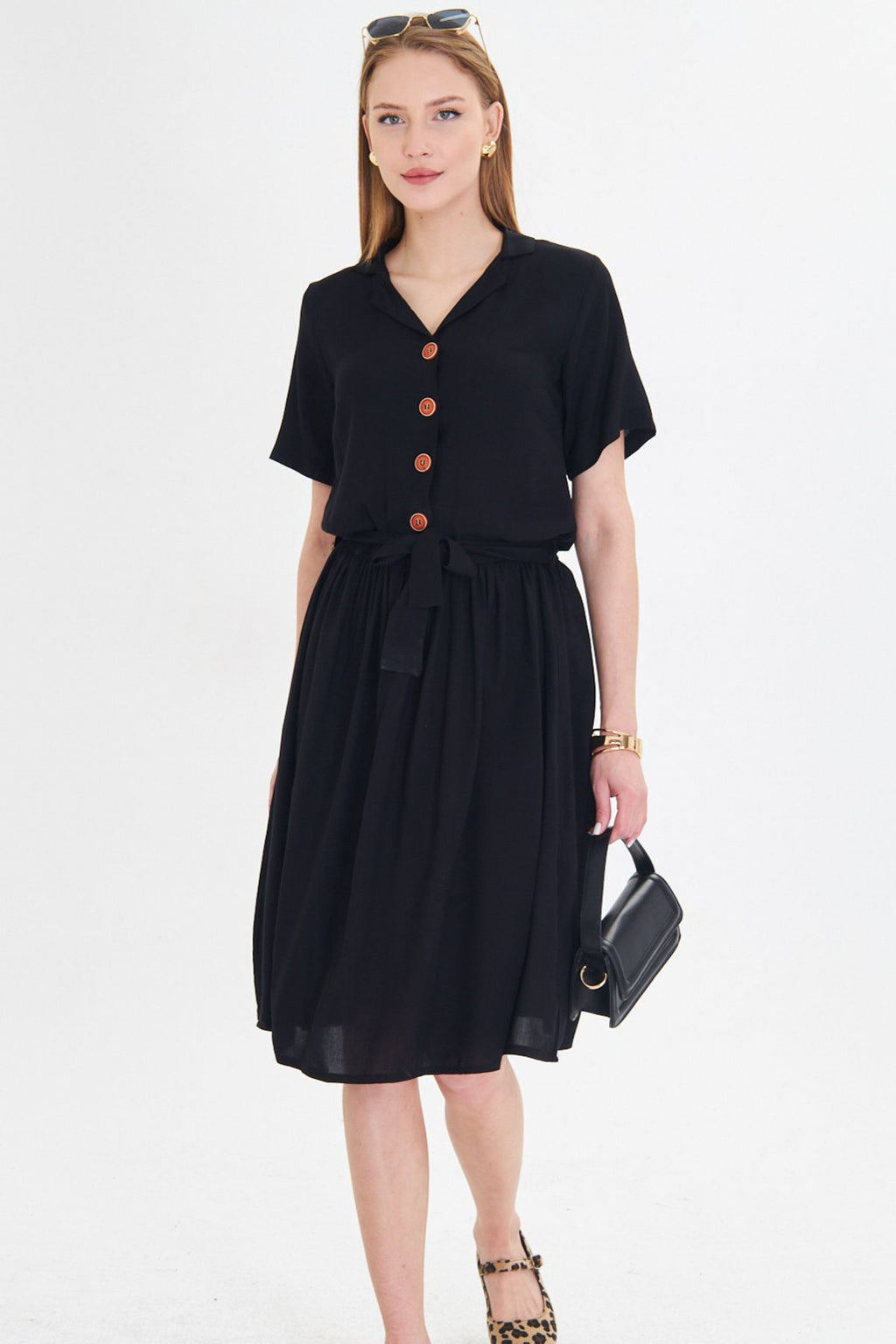Female black front buttoned waist shirred belt midi size dress ARM-24Y001068