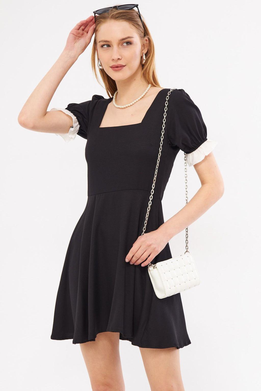 Female Black Front Rear Square Neck Sleeve Tip Detailed Watermelon Sleeve Kloş Mini Dress ARM-24Y001062