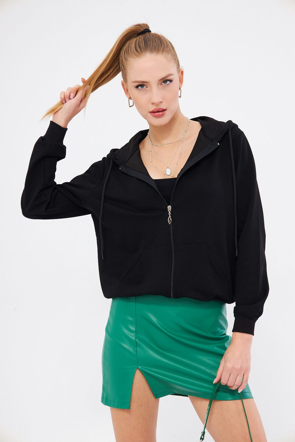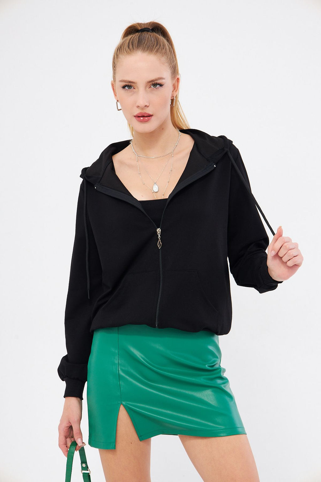 Female black front zipper pocket hooded Sweatshirt ARM-22Y024057
