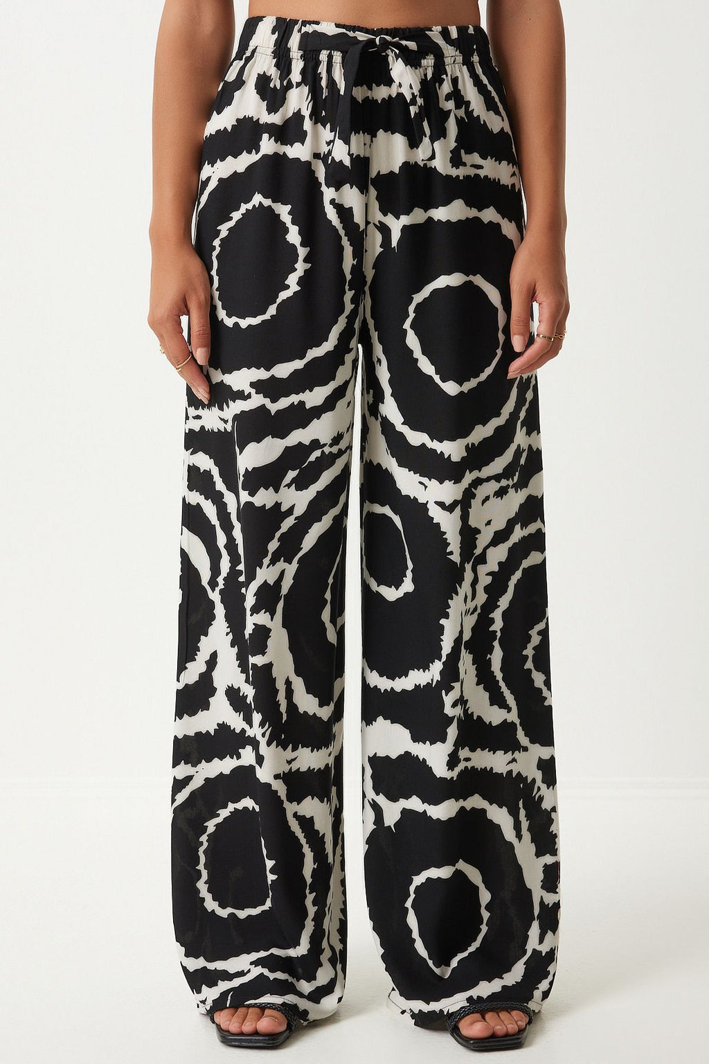 Female black light cream pattern draped viscose palazzo pants EN00606