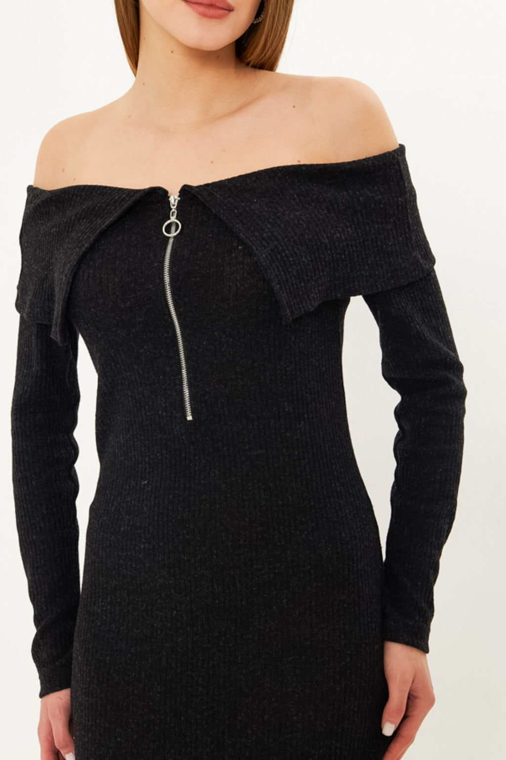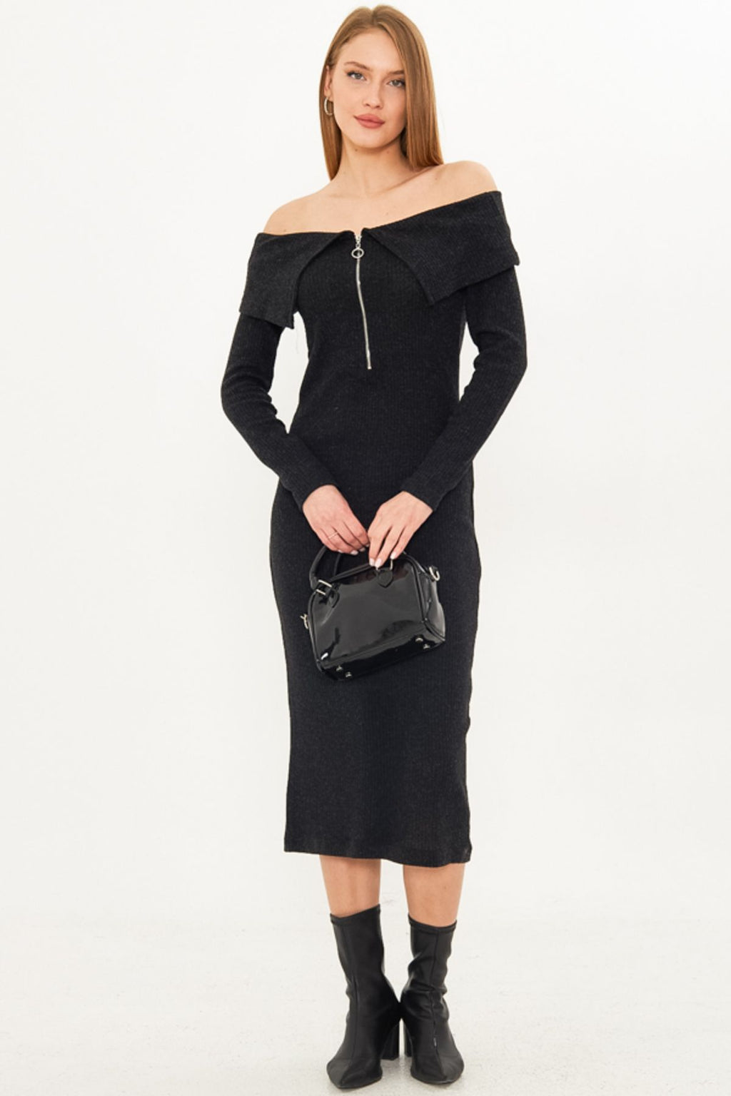 Female black low shoulder front zipper slit midi height knitwear dress ARM-25K001089