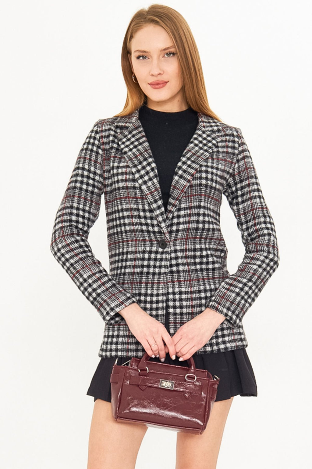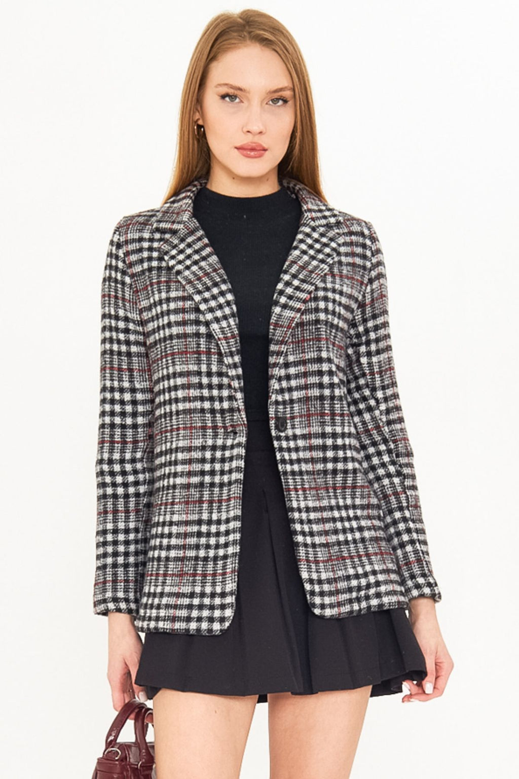 Female black plaid pattern single button stamp jacket ARM-25K001083