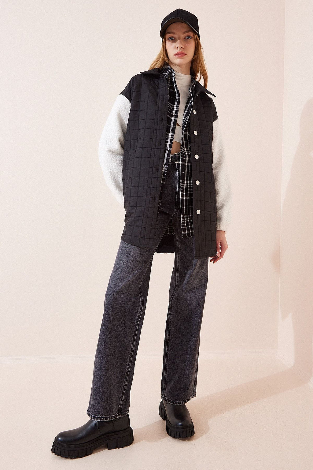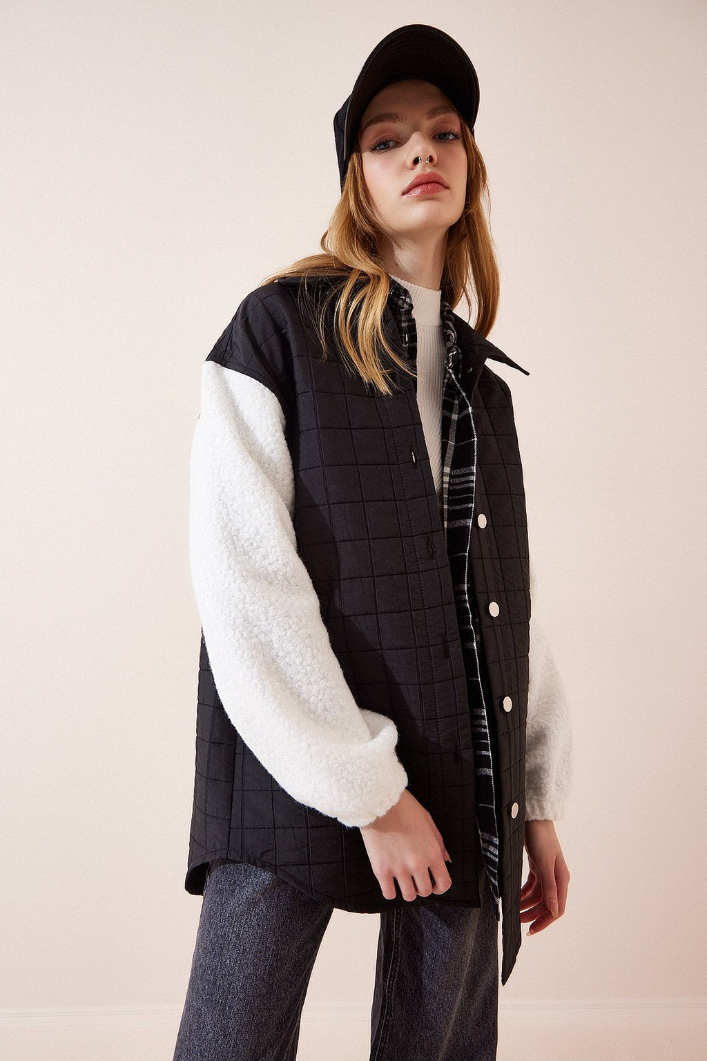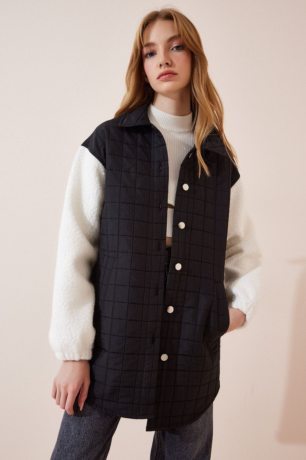 Female Black Polo Yaka Plush Arm Detail Jacket DD01146