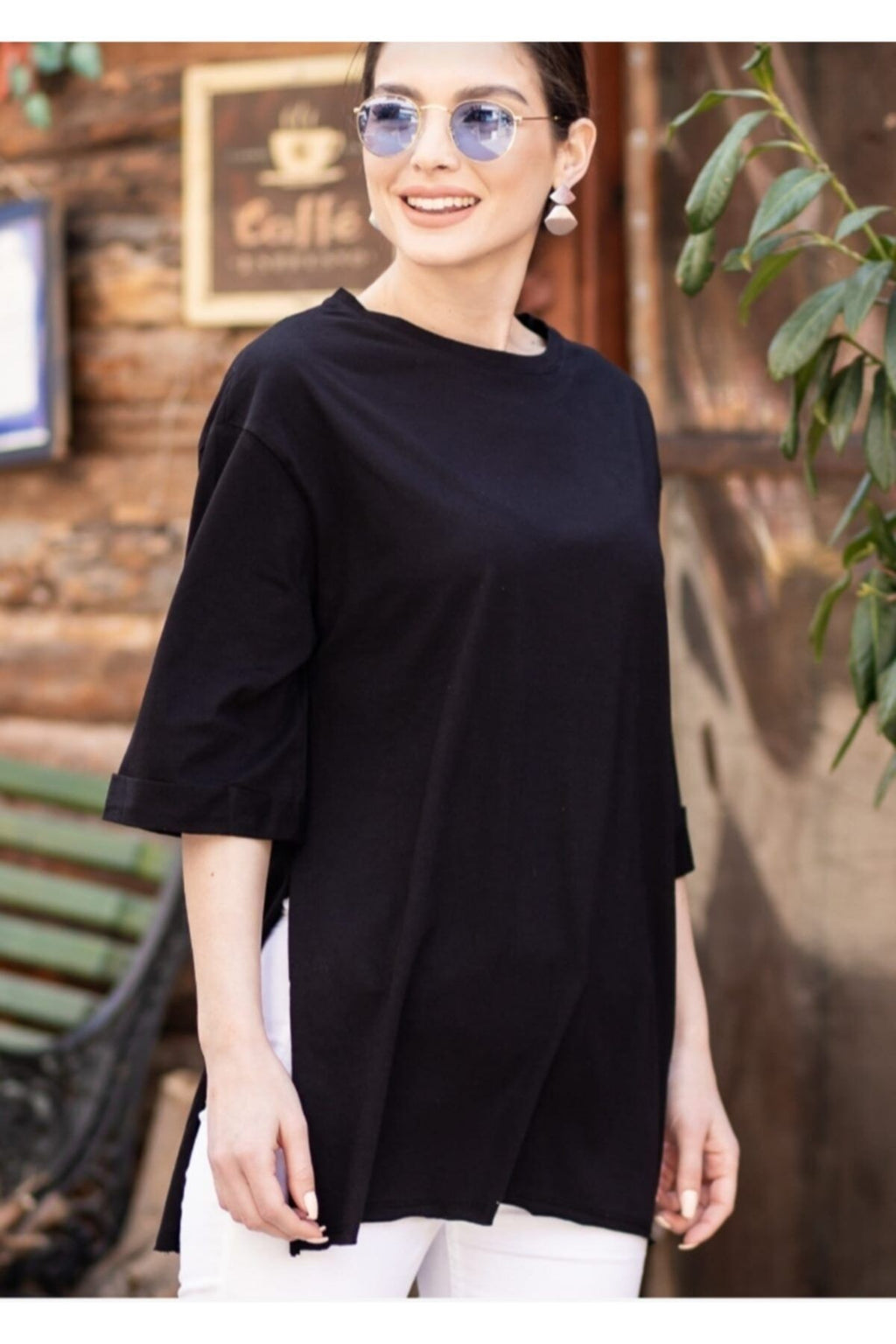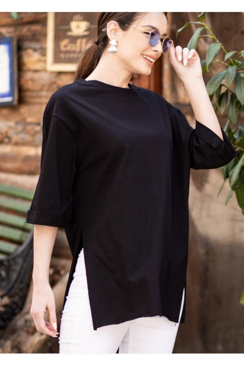Female black round collar wide sleeve side slits T-shirt Arm-19y012003