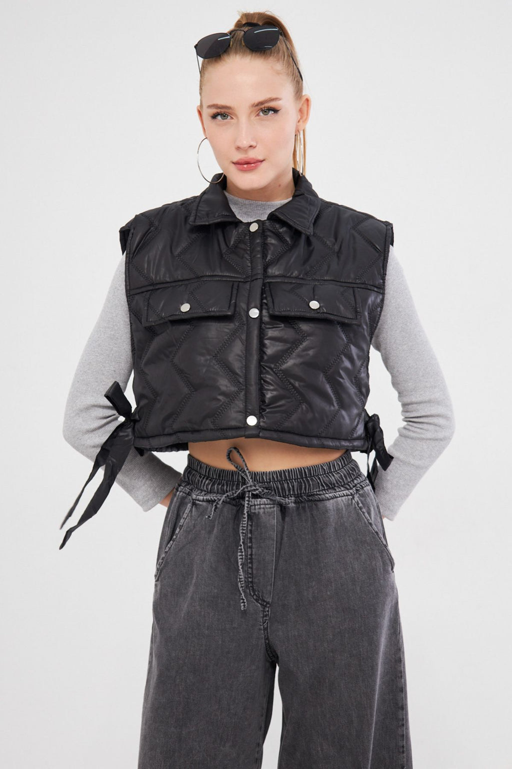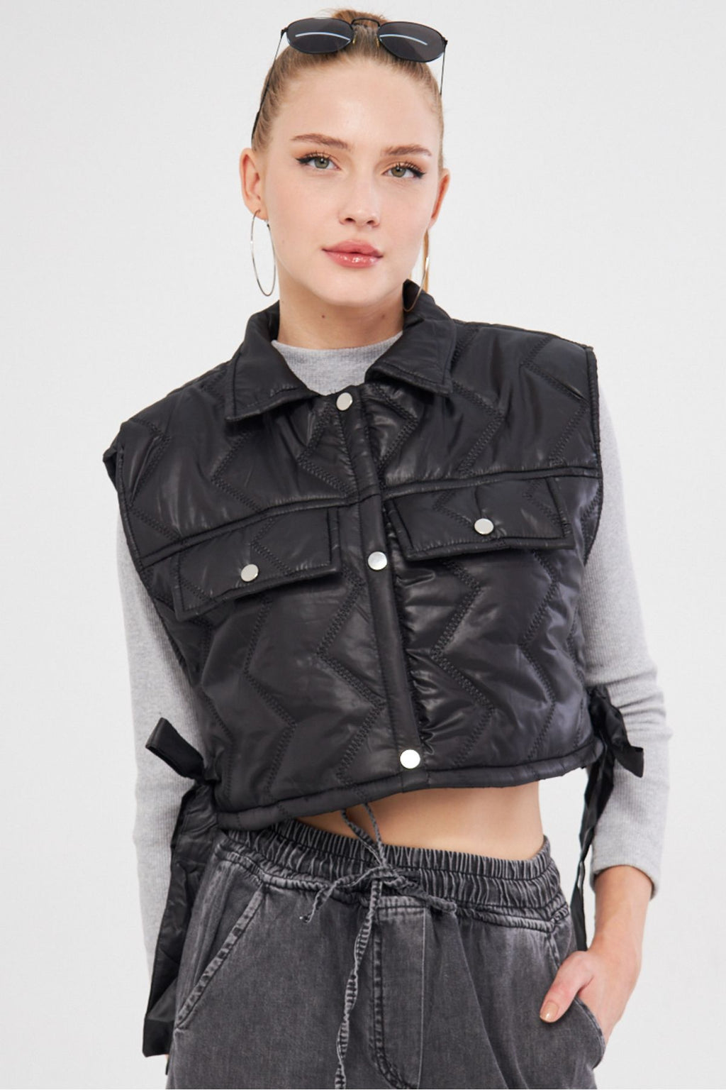 Female Black Sides Connecting Detailed Pocket Crop Vest ARM-25K025007