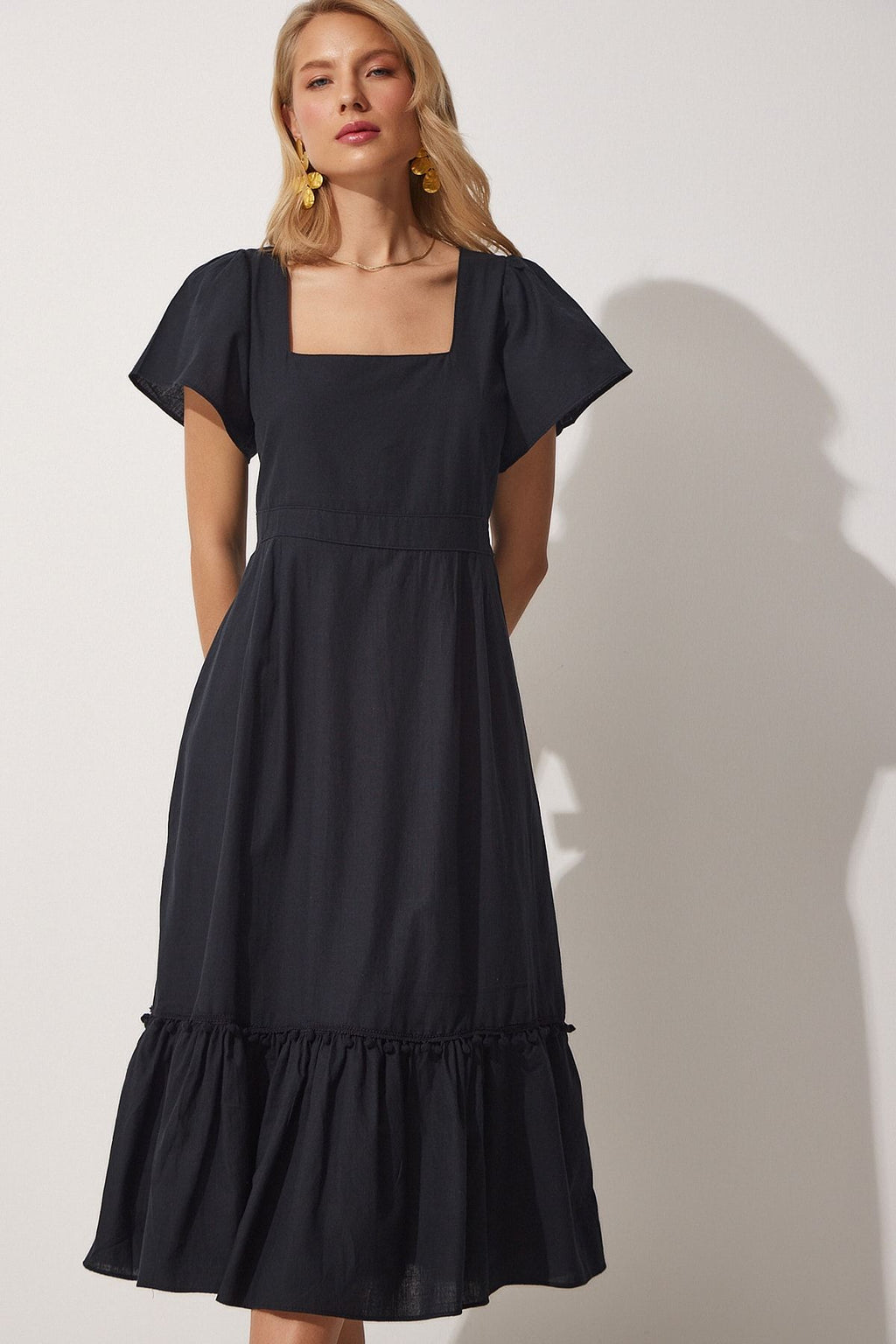 Female black square collar linen dress JH00046