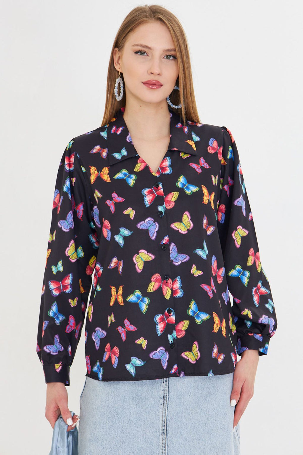 Female Black V-Neck Balloon Arm Patterned Shirt ARM-25Y001016
