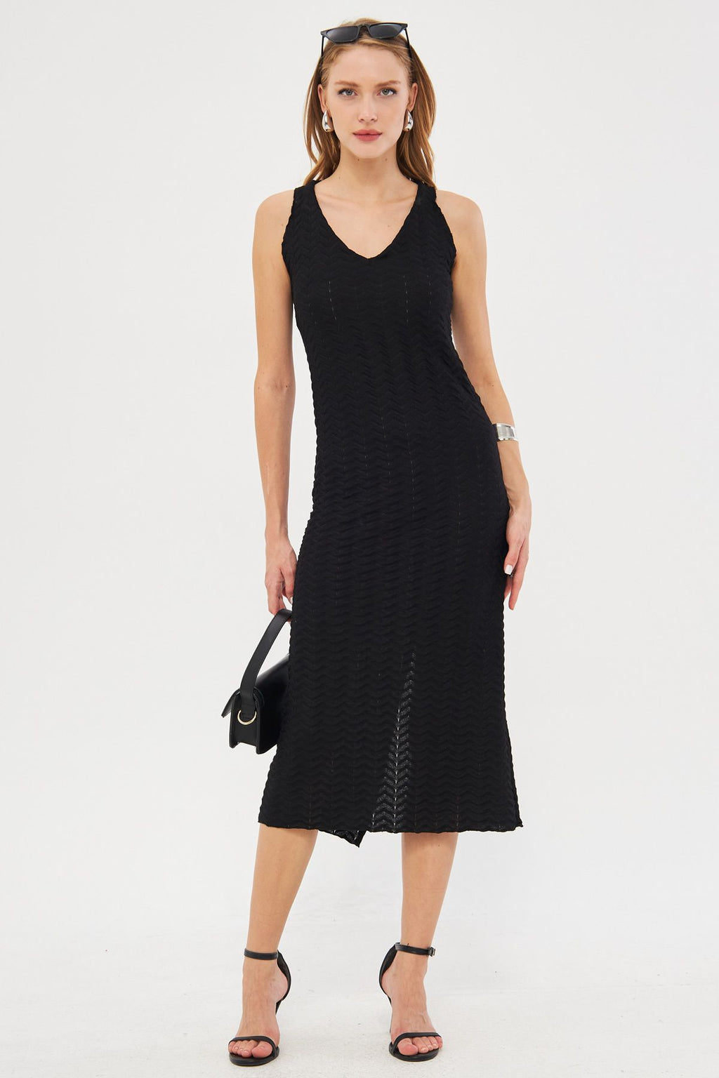 Female Black V-Neck Sitting Behind Behind Slitting Patterned Midi Boy Dress ARM-24Y001102