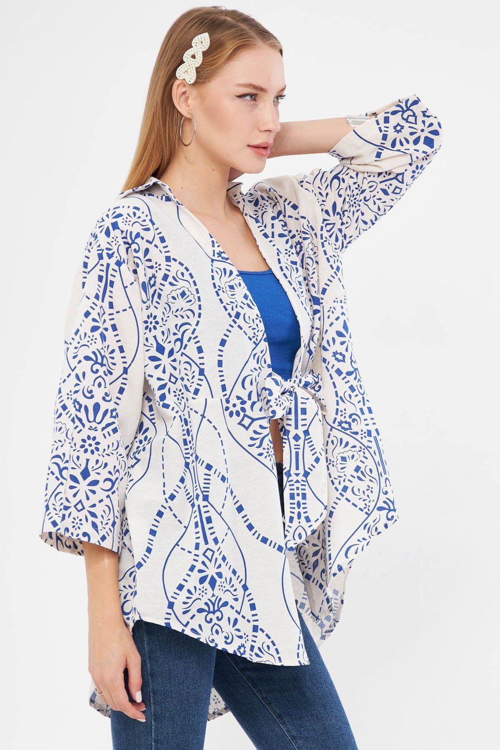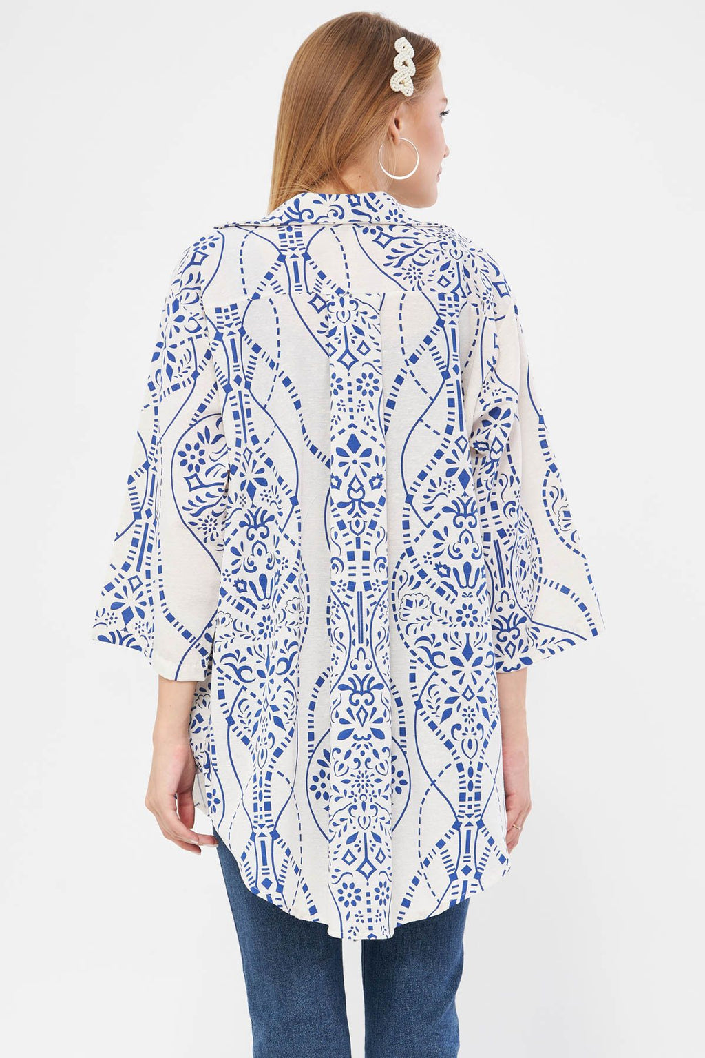 Female Blue White Patterned Linen-looking front-binding kimono shirt ARM-24Y001079