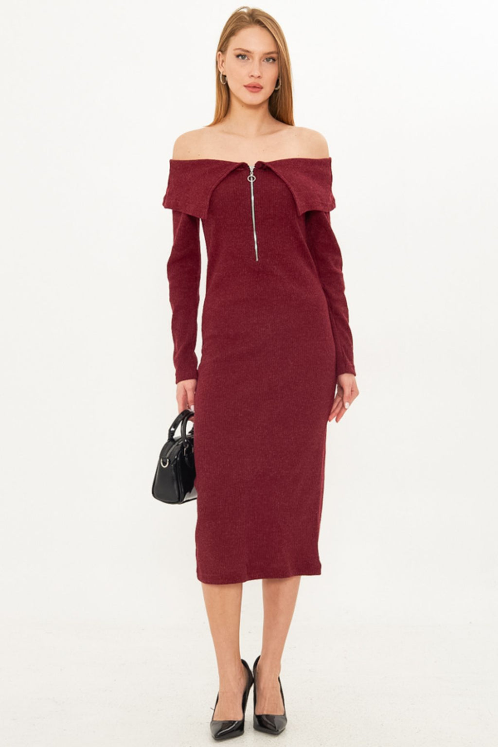 Female Bordeaux Low Shoulder Front Zippered Slit Midi Boynlet Dress ARM-25K001089