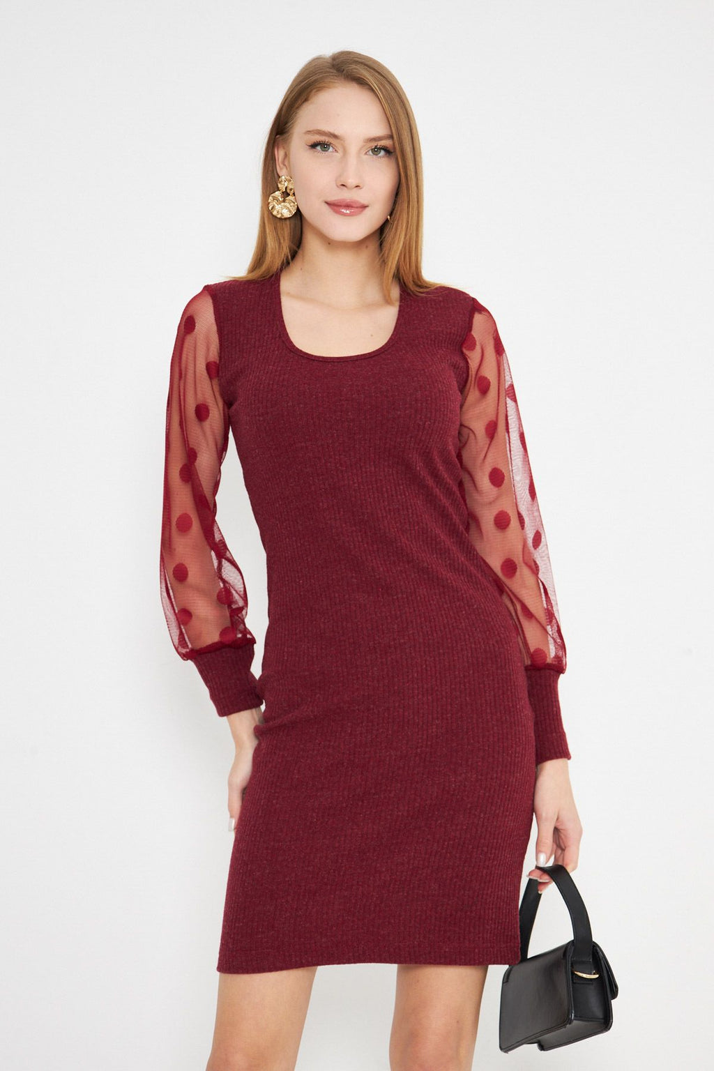 Female Bordeaux U Yaka Sitting on the Body Arms Tulle Detail Kashkorse Knitwear Dress ARM-25K001068