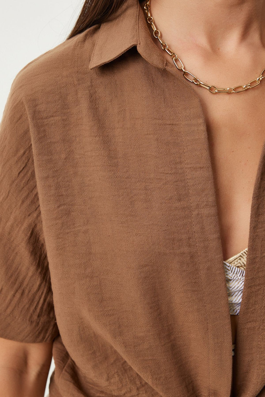 Female brown binding detailed linen blouse MX00151