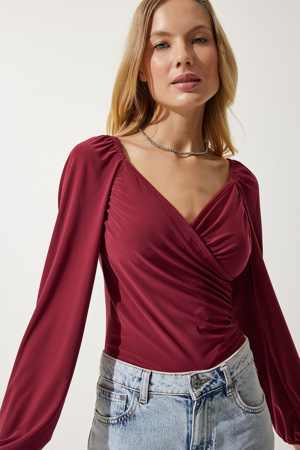 Female cherry elastic balloon sleeve sandy knit blouse FF00154