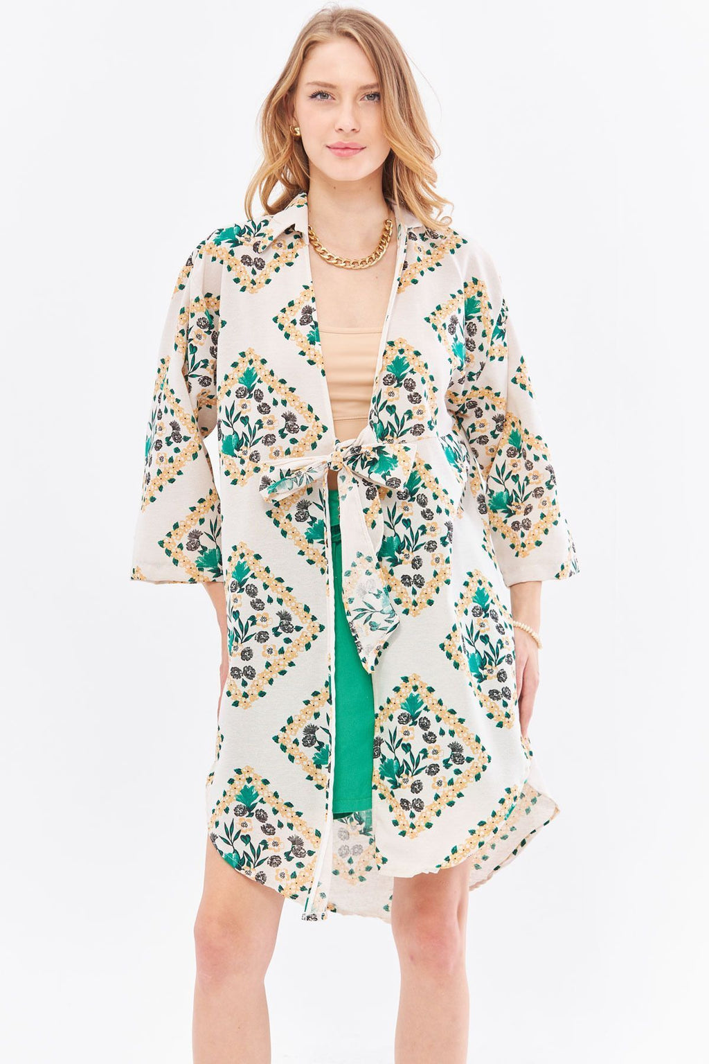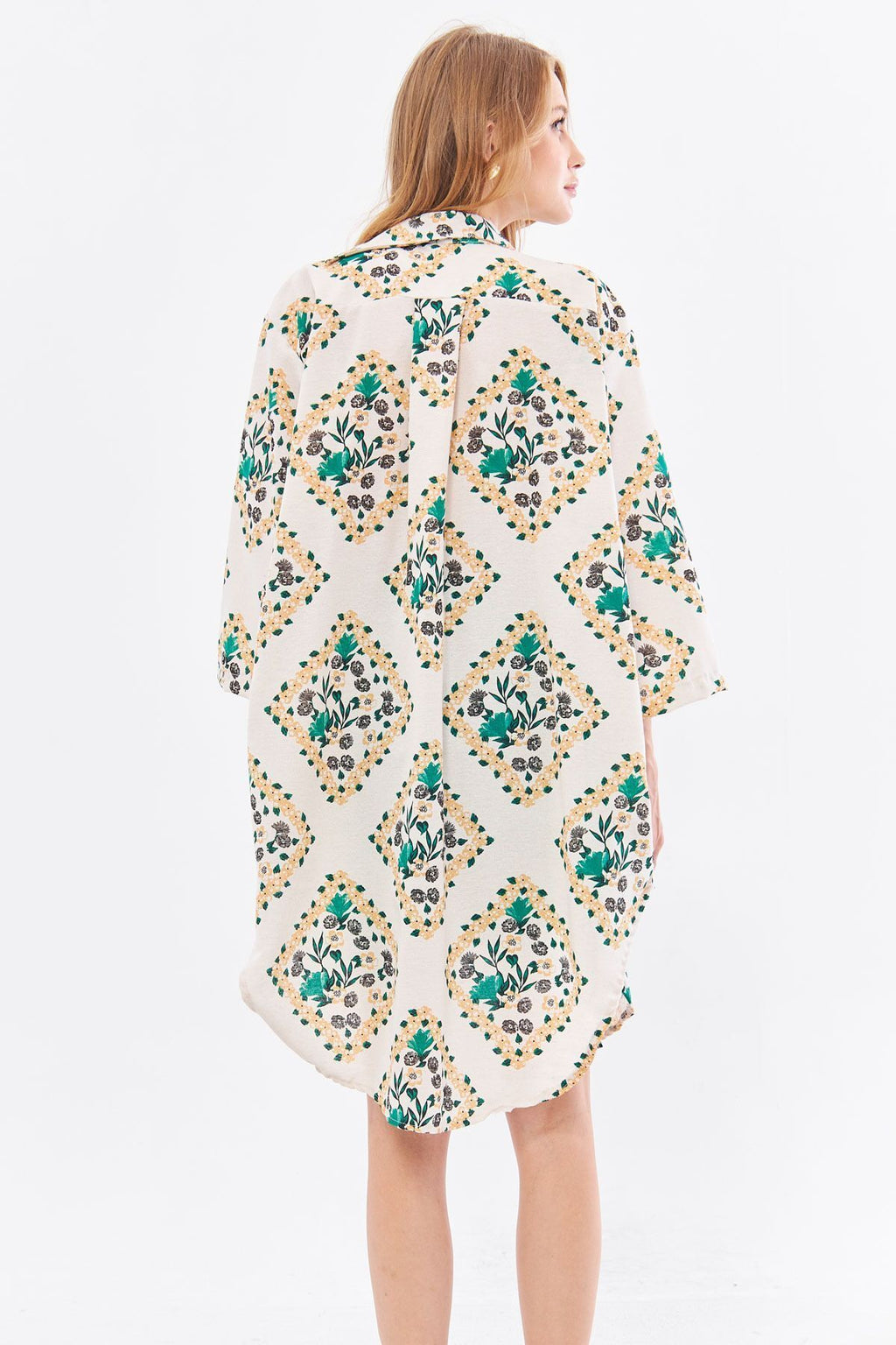 Female Dark Green Linen-Looking Patterned Patterned Midi Boy Kimono Shirt ARM-24Y001096