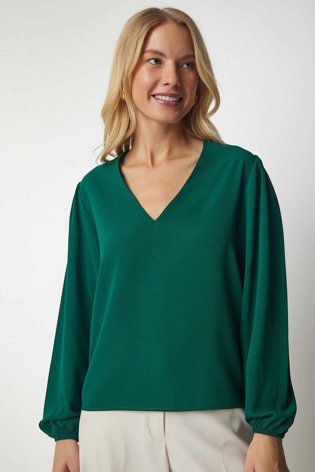 Female Emerald Green V -Neck Crepe Blouse UB00153