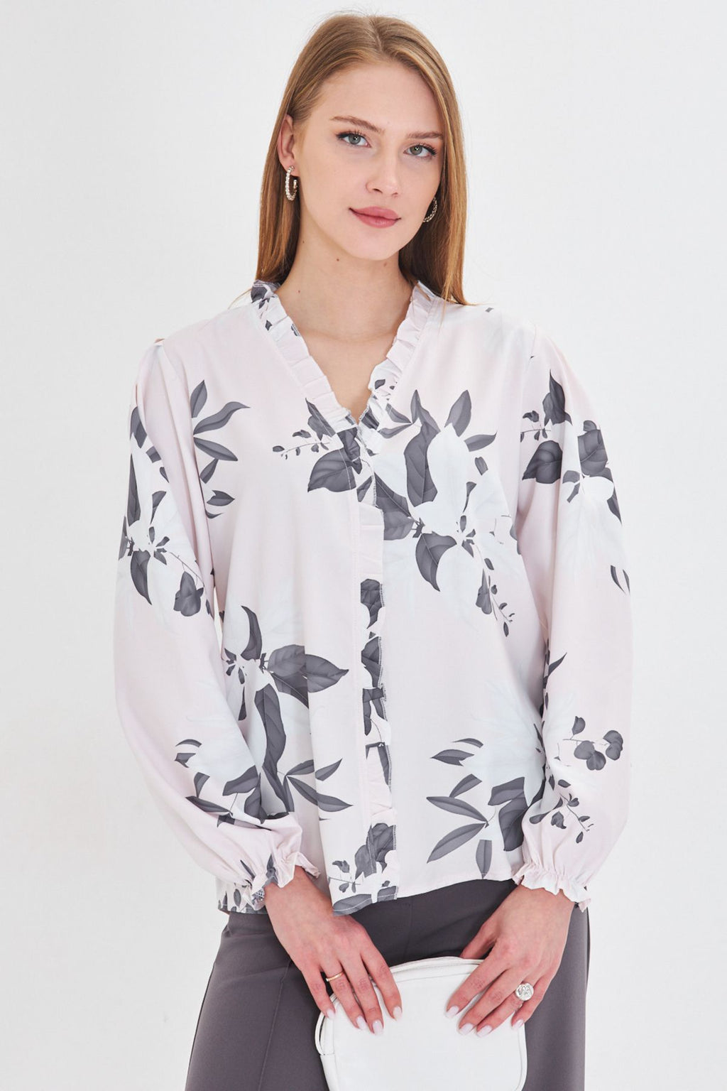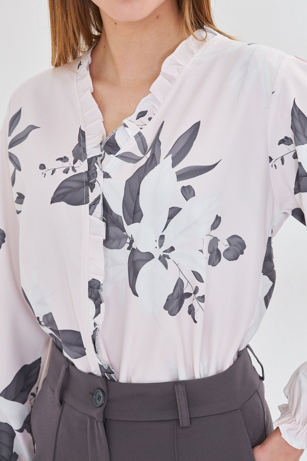 Female Gray Side and Ruffle Arms with Rubbins Long Sleeve Blouse ARM-25Y001015