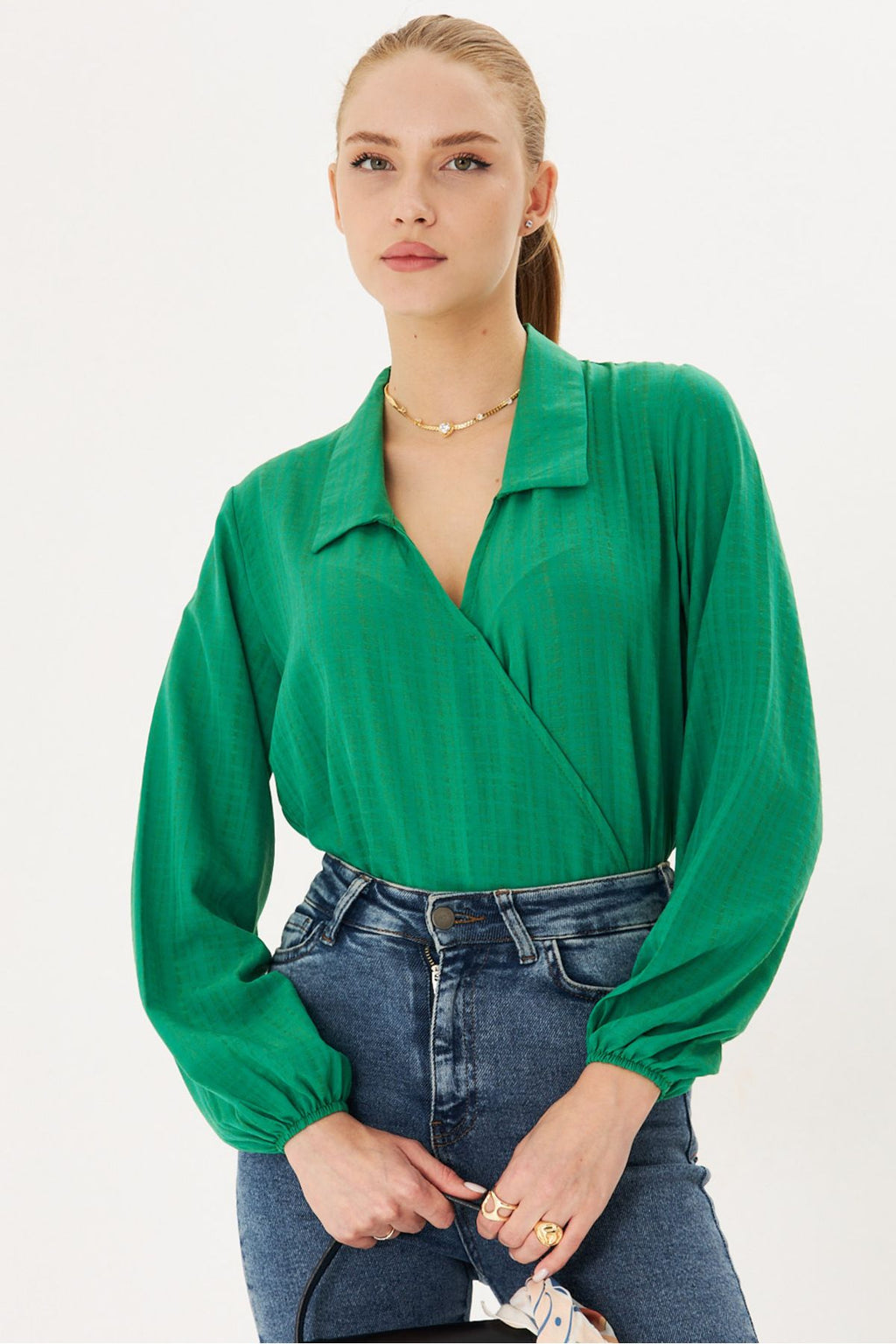 Female green arm and waist-tire-collar cruve blouse ARM-25K001041