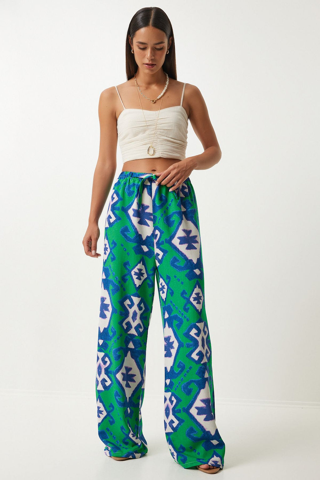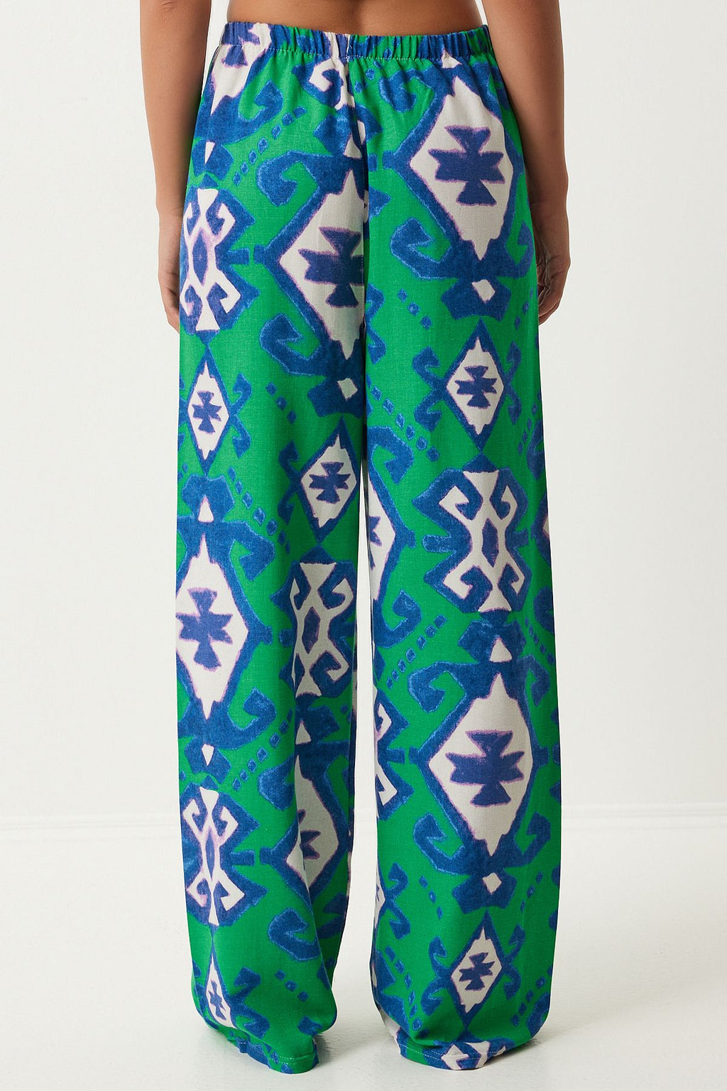 Female Green Blue Patterned Raw Linen Palazzo Pants BH00397