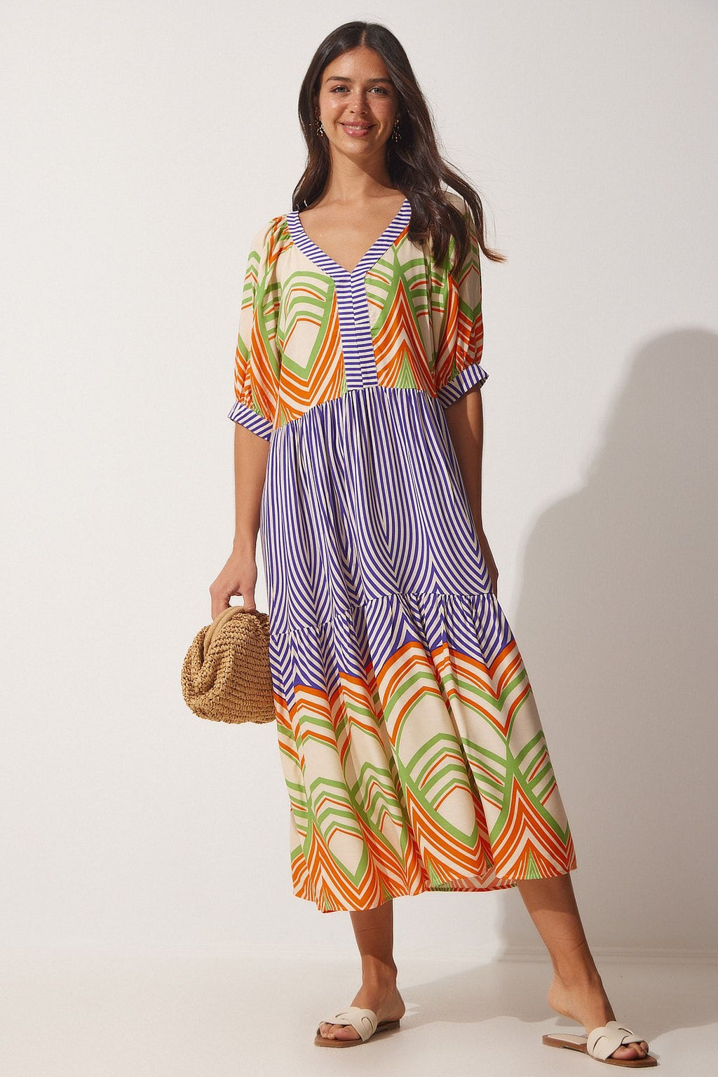 Female Green Orange Patterned V -Neck Summer Viscose Dress DD01215