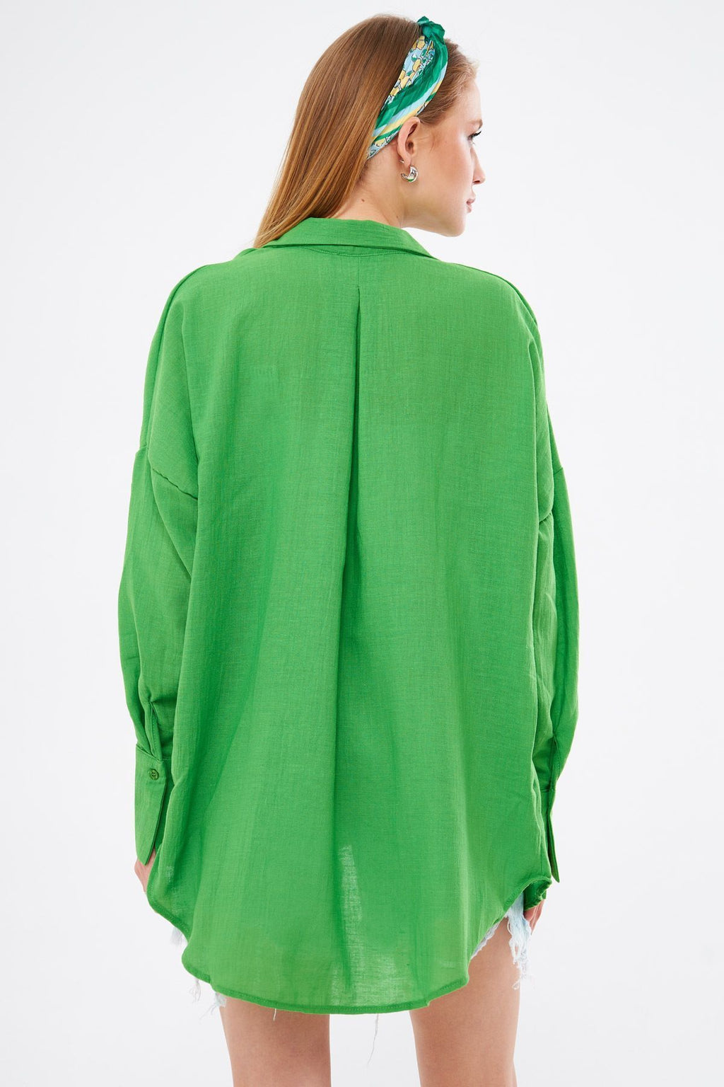 Female Green Oversize textured linen-looking large cuff shirt ARM-24K001001