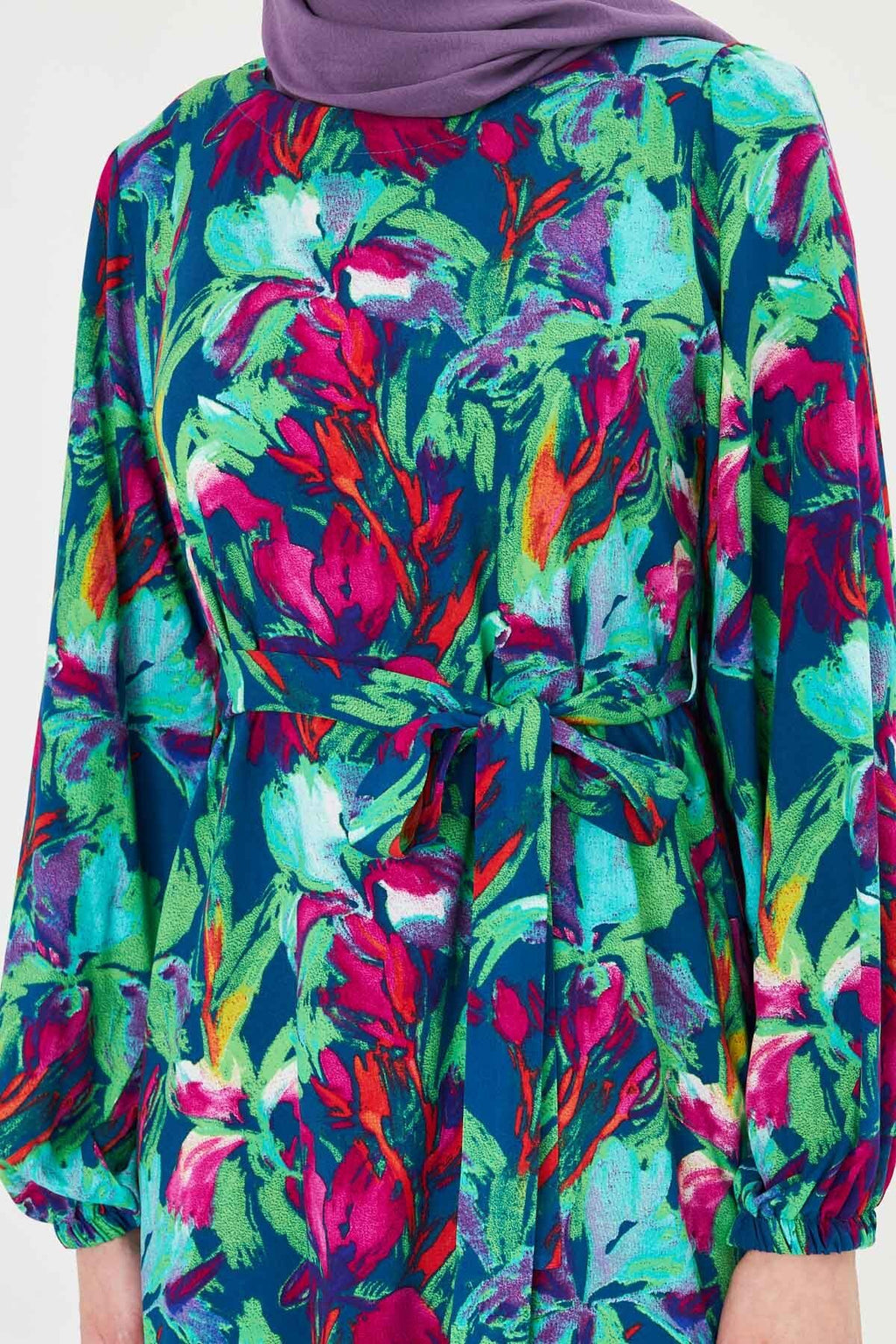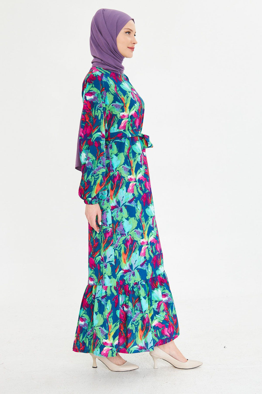 Female green zero collar behind the zipper skirt end with frilly belt long hijab dress ARM-25K001101