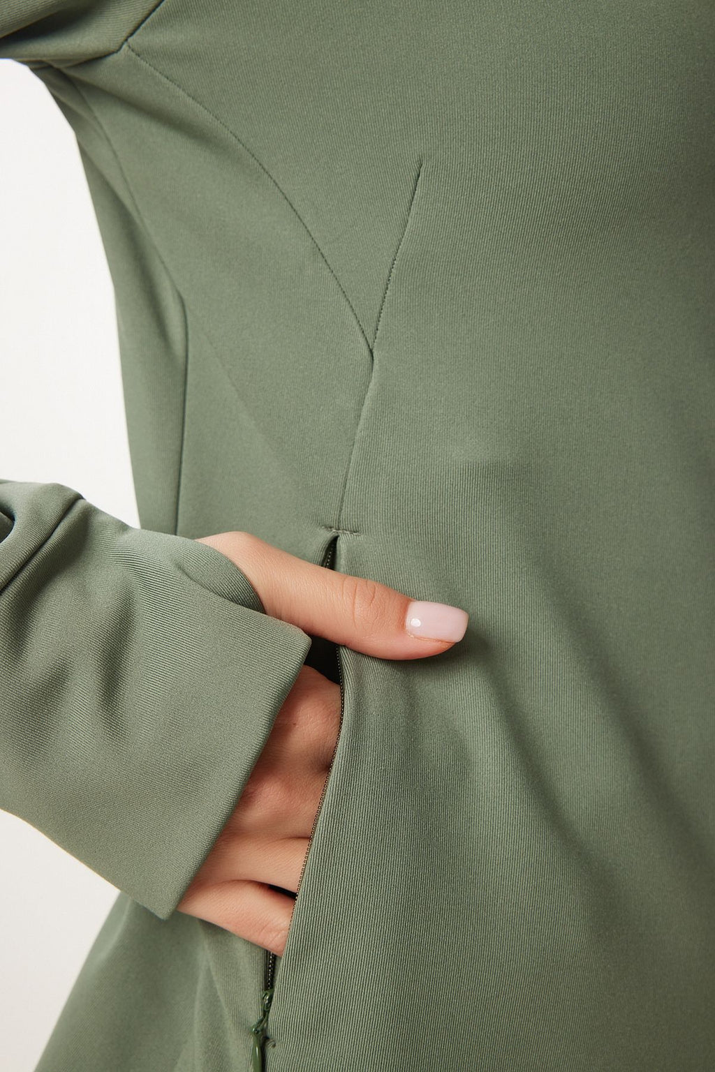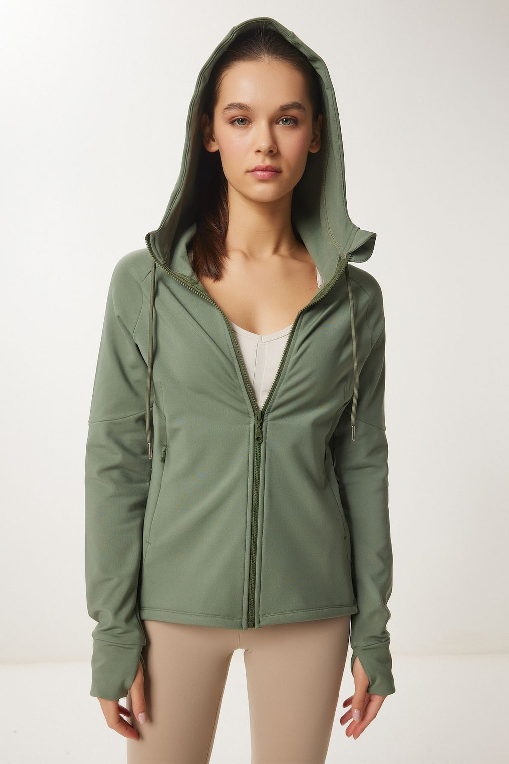 Female Khaki Finger Detailed Hooded Zipper Knitting Sweatshirt VX00007