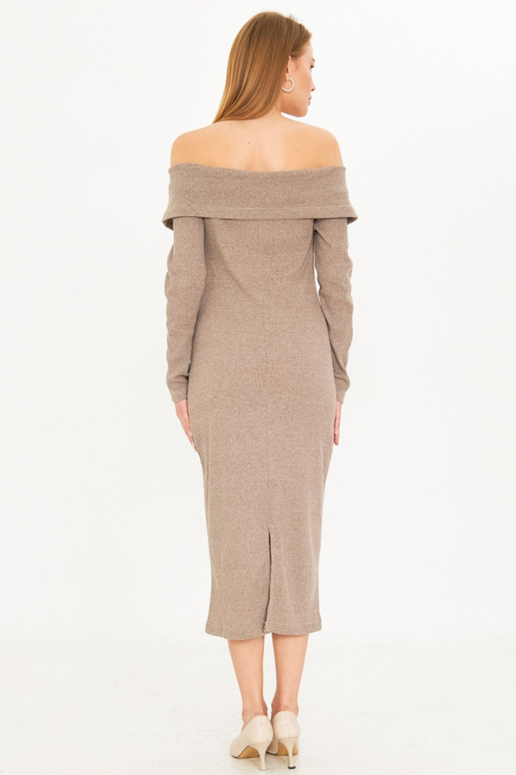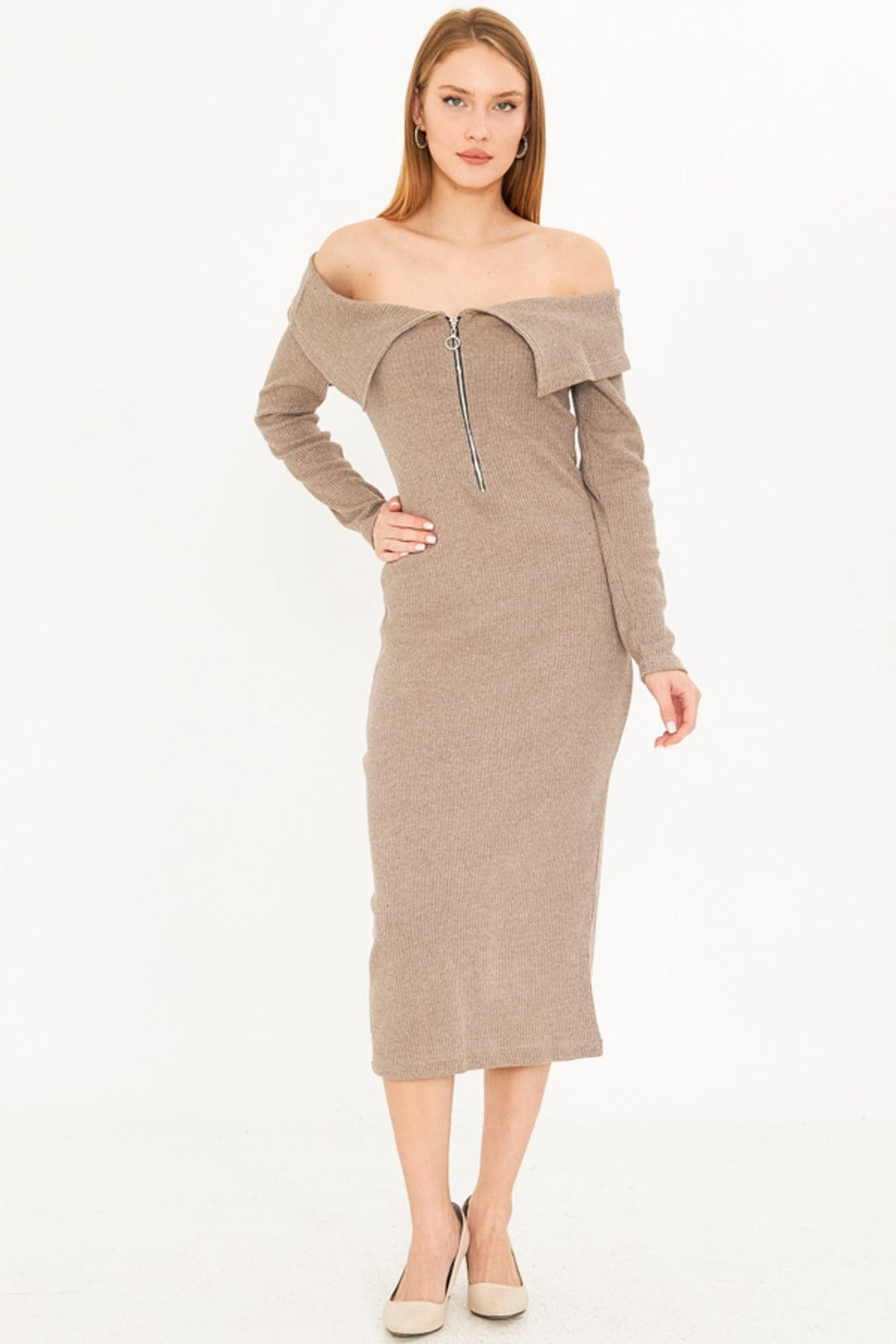 Female mink low shoulder front zipper slit midi height knitwear dress ARM-25K001089