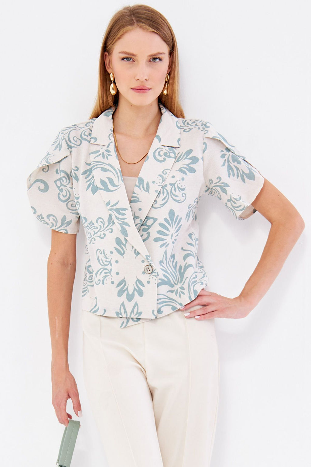 Female Mint Linen-Looking Patterned Band Slit Crop Short Sleeve Jacket ARM-24Y001095