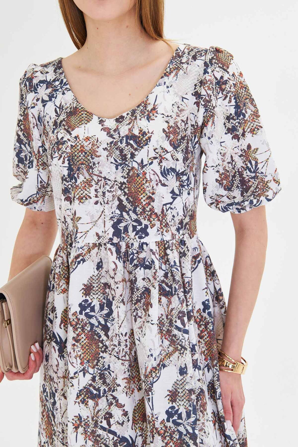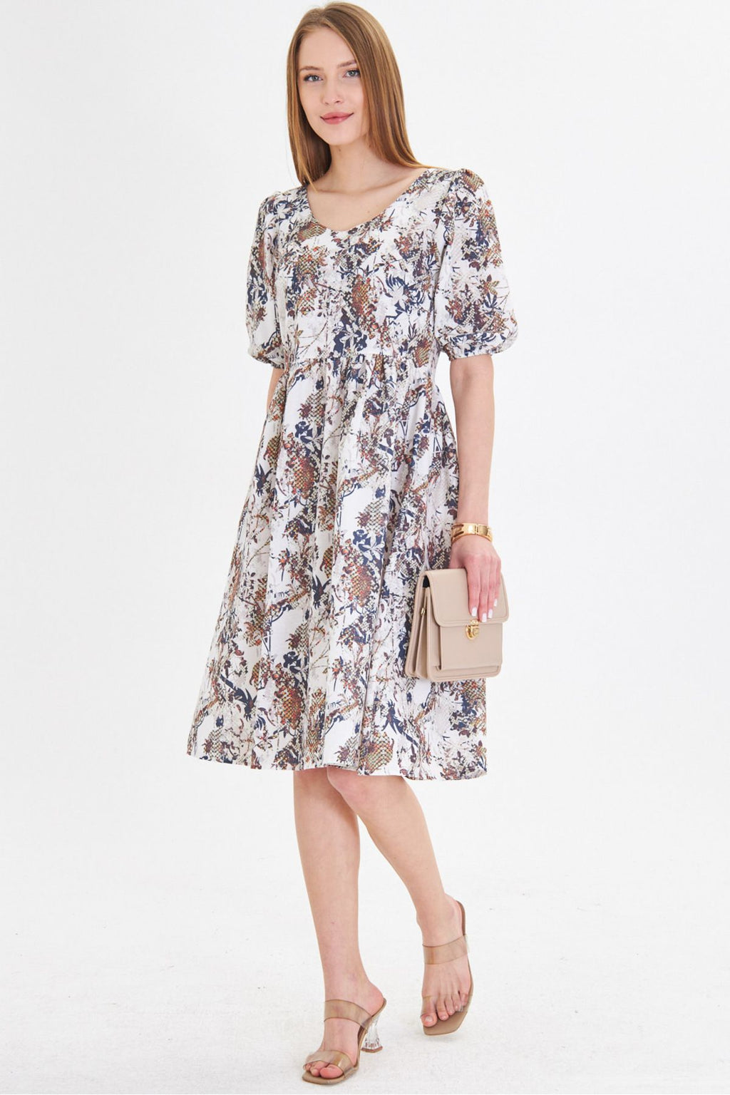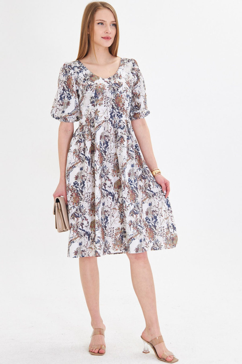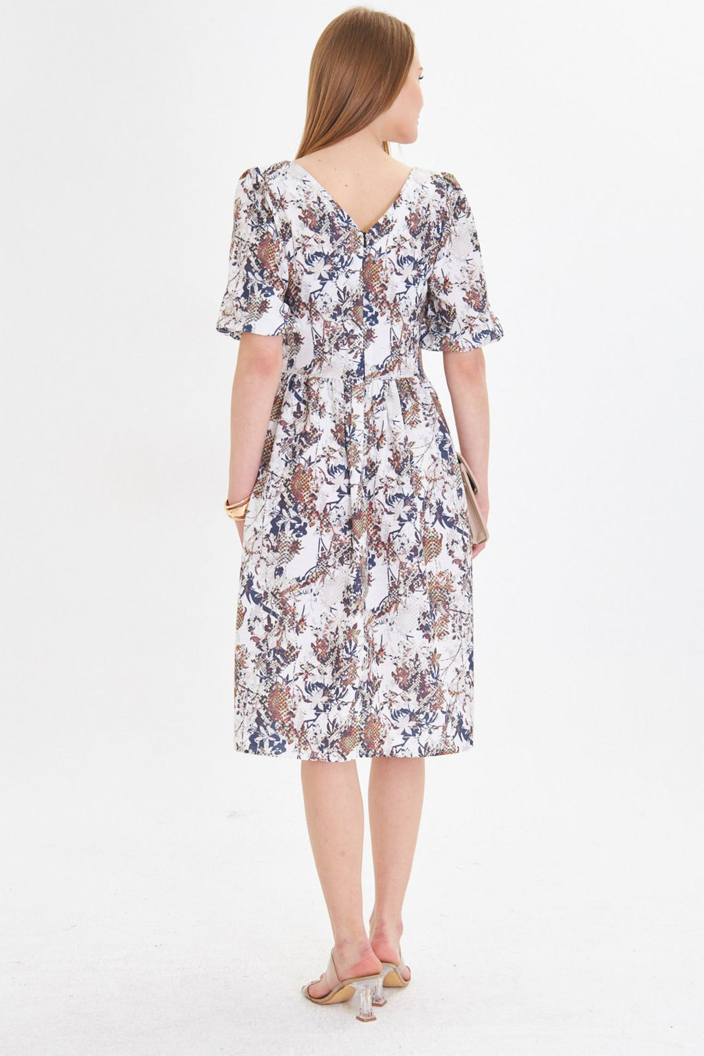 Female navy blue neck arms with rubber waist shirred midi size dress ARM-25Y001003