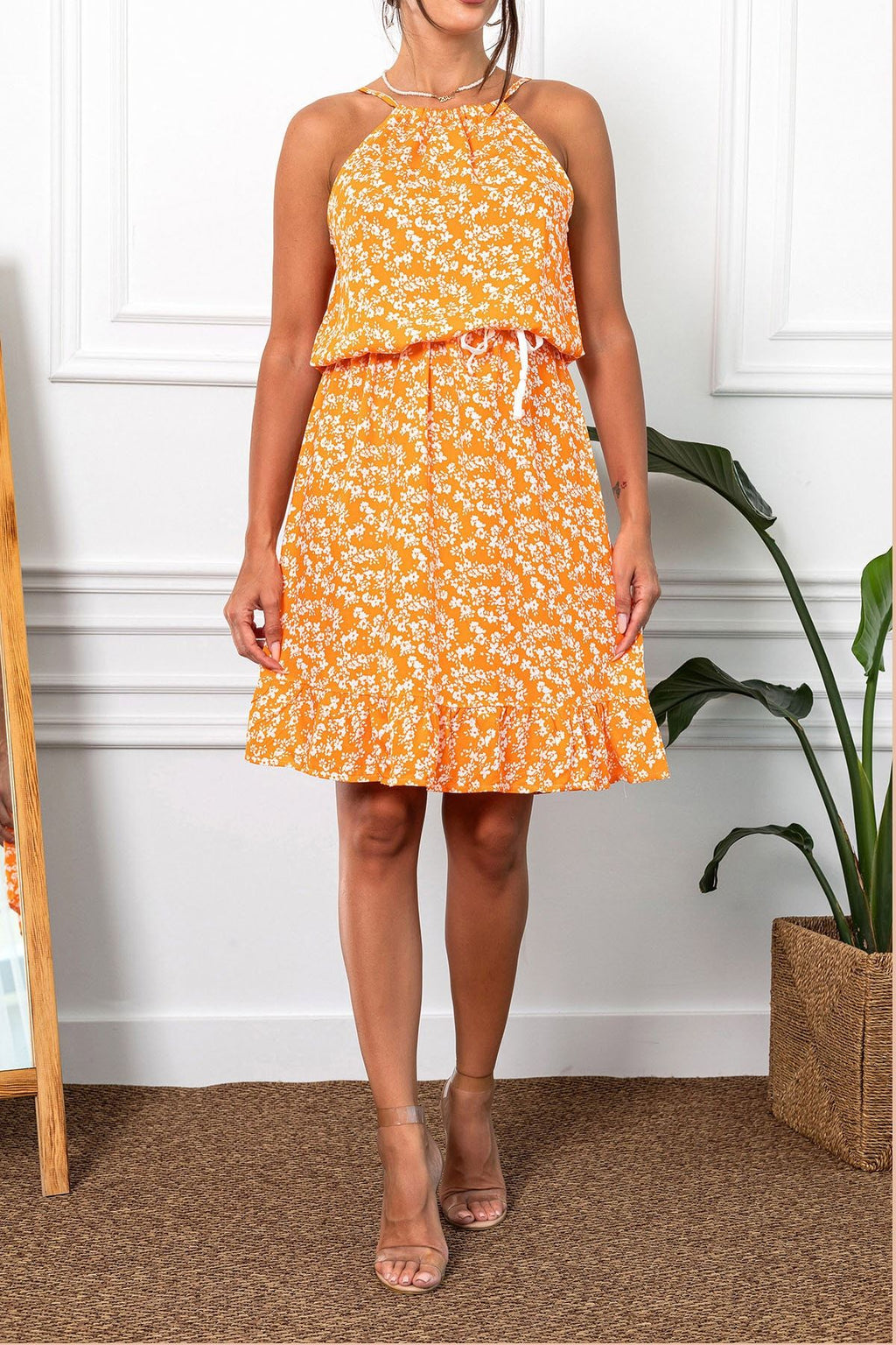 Female Orange Neck Tinding Waist Belled Skirt Ruffed Dress ARM-23Y001112