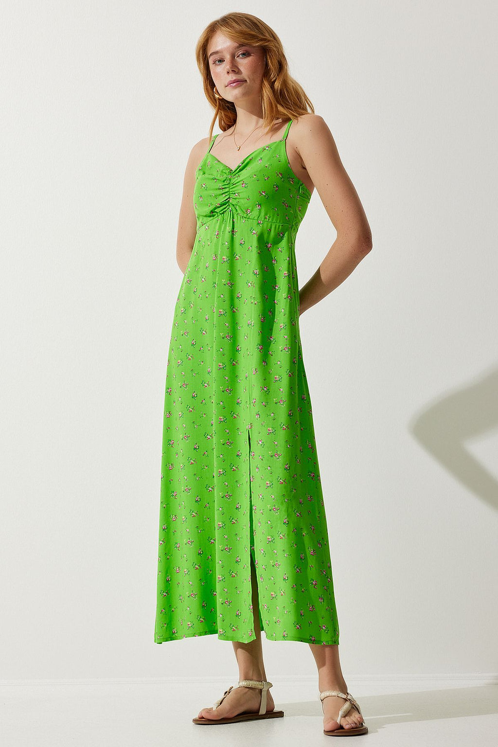 Female peanut green hanger with patterned viscose dress ub00236